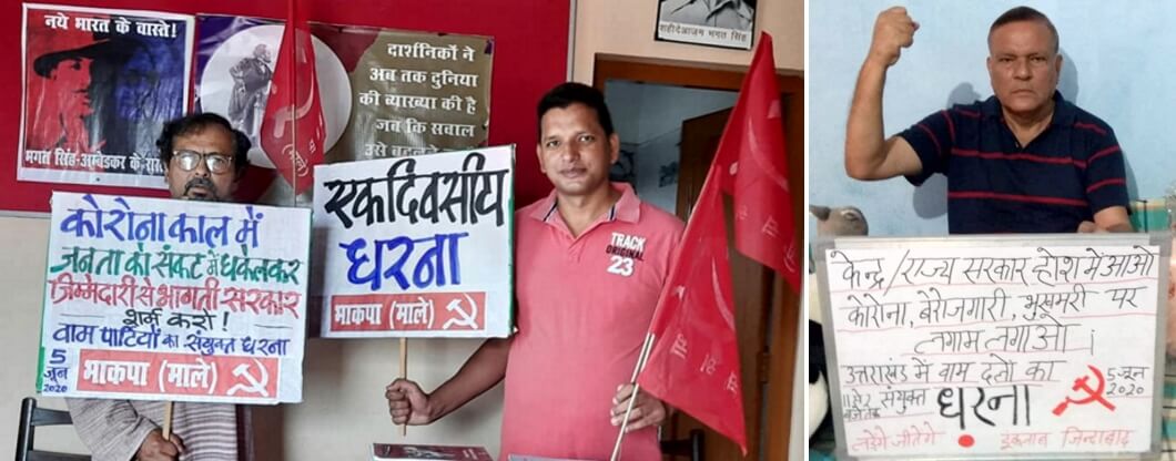 क्वारन्टीन सेंटरों की दुर्दशा, स्वास्थ्य व्यवस्था की बदहाली और प्रवासियों को लेकर बनाये जा रहे भय के माहौल के खिलाफ उत्तराखंड में वामपंथी व जनवादी संगठनों, व्यक्तियों की ओर से संयुक्त धरने का आह्वान किया गया था. इसके तहत बुद्ध पार्क में लाॅकडाउन के नियमों का पालन करते हुए धरना आयोजित किया गया. इस धरने में भाकपा(माले), क्रांतिकारी लोक अधिकार संगठन, अम्बेडकर मिशन एन्ड फाउंडेशन, ‘पछास’ आदि संगठन शामिल रहे.