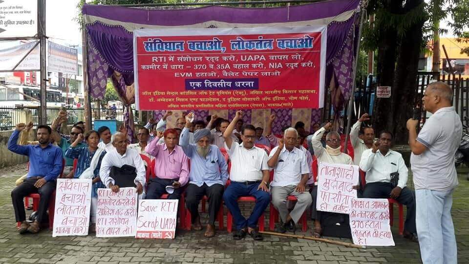 धरने के बाद सूचना अधिकार बचाओ, यूएपीए हटाओ, 370 व 35-ए बहाल करो, एनआईए के नाम पर साम्प्रदायिक ध्रुवीकरण बंद करो, ईवीएम हटाओ-बैलेट पेपर लाओ मांगों को लेकर पांच सूत्री ज्ञापन उपजिलाधिकारी के माध्यम से भारत के राष्ट्रपति को भेजा गया. धरने में सुंदर लाल आर्य, एचसी आर्य, अखिल भारतीय किसान महासभा के जिलाध्यक्ष बहादुर सिंह जंगी, द बुद्धिस्ट सोसायटी आॅफ इंडिया के हरीश आर्य, सीपीआई के उधमसिंह नगर जिला मंत्री एडवोकेट राजेन्द्र प्रसाद गुप्ता, ऐक्टू के प्रदेश अध्यक्ष निशान सिंह, केके बोरा, भाकपा(माले) जिला सचिव डाॅ. कैलाश पांडेय, पत्रकार जगमोहन रौतेला, इंद्रानगर जन विकास समिति के तस्लीम अंसारी, जाहिद अंसारी, नईम अहमद, साजिद सिद्दीकी, गोविंद कफलिया, महेश टम्टा, हरीशचंद्र आर्य, एडवोकेट एसडी जोशी, एडवोकेट योगिता, श्रमिक संयुक्त मोर्चा के प्रचार मंत्री राजेंद्र शाह, ललित मटियाली, कमल जोशी, एनडी जोशी, नैन सिंह कोरंगा, देवेन्द्र रौतेला, महेश, पनिराम आदि शामिल रहे.