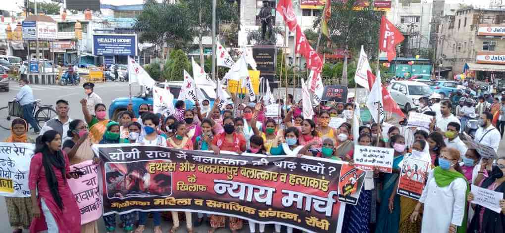 3 अक्तूबर 2020 को रांची में महिला और सामाजिक संगठनों ने सैनिक बाजार से अल्बर्ट एक्का चौक तक न्याय मार्च निकाला और हाथरस और बलरामपुर बलात्कार व वीभत्स हत्याकांडों का विरोध किया. हाथों में तख्तियां और झंडे लेकर जोरदार नारों के साथ न्याय मार्च सैनिक बाजार से निकलकर डेली मार्केट, मेन रोड, शाहिद चैक होते हुए अल्बर्ट एक्का चौक पहुंचा जहां घंटों प्रदर्शन किया गया. योगी राज में बलात्कार की बाढ़ क्यों जवाब दो, बलात्कारियों को संरक्षण देना बंद करो, गांधी तेरे देश में, भेड़िये साधु के वेश में आदि जोरदार नारों के साथ सैकड़ों की संख्या में महिलाओं ने प्रदर्शन में भाग लिया. न्याय मार्च में ऐपवा, एडवा, अखिल भारतीय महिला समाज, आइसा, राईट टू फूड, ऐक्टू समेत कई महिला और सामाजिक संगठनों से जुड़ी महिलाओं ने भाग लिया. प्रदर्शनकारियों को संबोधित करते हुए ऐपवा नेत्री ऐति तिर्की ने कहा कि बलात्कारियों को सजा देने के बजाय योगी सरकार पीड़ित परिवारों को ही नजरबंद कर दी है. क्या यही है नारी का सम्मान? बलात्कारियों और हत्यारों को योगी सरकार संरक्षण दे रही है. सरकार की शह के बगैर अधिकारियों की ये ताकत नहीं थी कि घर वालों की सहमति के बगैर पीड़िता के शव को जला दिया जाता. भाजपा शासित राज्यों में बेटियां सुरक्षित नहीं हैं. महिला समाज की सरजाना फारुखी ने कहा कि अब हालात ऐसे हैं कि बेटियों को भाजपा नेताओं से ही बचाने की जरूरत है. एडवा की वीना लिंडा ने कहा कि भगवा राज में महिलाओं का अपमान देश की जनता माफ नहीं करेगी. न्याय मार्च में नंदिता भट्टाचार्य, नौरीन अख्तर, मेवा उरांव, सरिता तिग्गा, सीमा कोरिया, राइट टू फूड की सुनीता नारायण, सनम लोहरा, लक्ष्मी पासवान, एडवा की वीना लिंडा, पुष्पा तिग्गा, रेनु प्रकाश, अखिल भारतीय महिला समाज की सरजाना फारूखी, काजल देवी, पार्वती देवी आदि मुख्य रूप से उपस्थित थीं. कार्यक्रम के जरिए राज्यपाल को पत्र प्रेषित कर बलात्कार की घटनाओं पर रोक लगाने के लिए कठोर कानून की मांग की गई. कार्यक्रम में ऐक्टू के भुवनेश्वर केवट, अजय सिंह, सुखनाथ लोहरा, आकाश कुमार आदि भी उपस्थित थे.