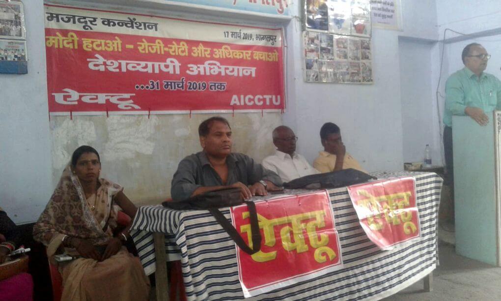 श्रम कानूनों में मजदूर विरोधी संशोधन, रोजगार, सामाजिक सुरक्षा, ट्रेड यूनियन व मजदूर अधिकार की मांग पर तथा युद्धोन्माद नहीं शांति आदि के नारे के साथ स्थानीय गांधी शांति प्रतिष्ठान, भागलपुर में 17 मार्च को ऐक्टू ने जिला स्तरीय मजदूर कन्वेंशन आयोजित किया जिसमें असंगठित क्षेत्र के मजदूर प्रतिनिधियों ने बढ़-चढ़कर हिस्सा लिया .