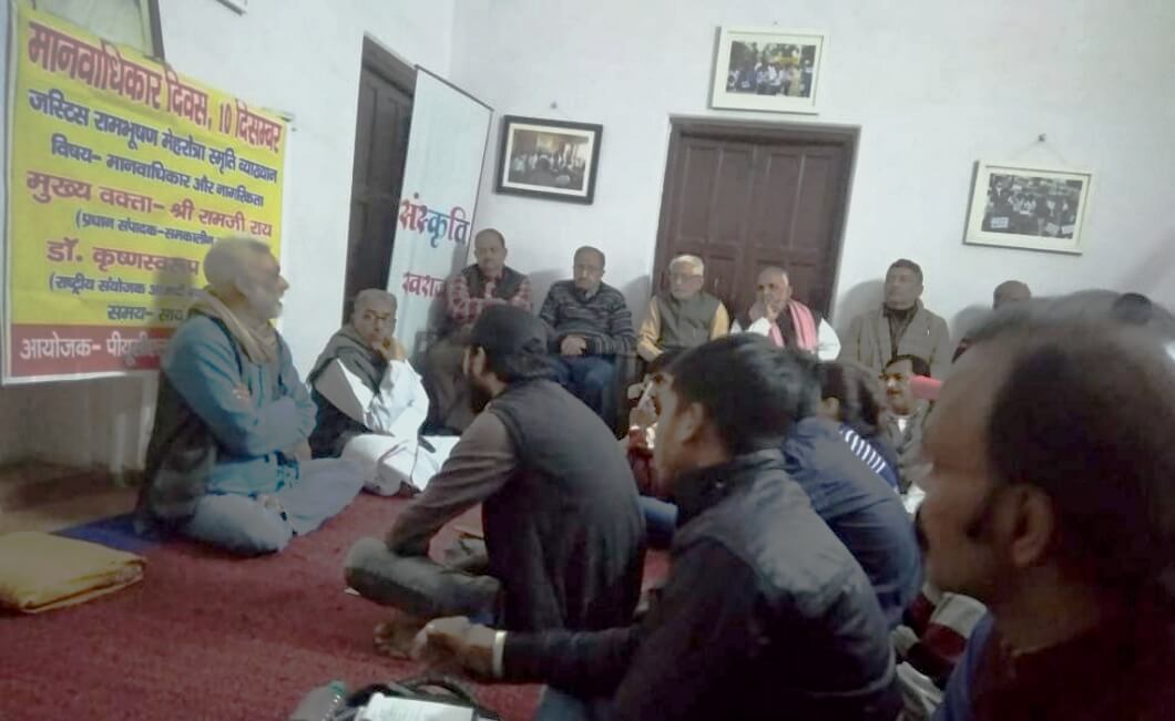 इलाहाबाद में पीयूसीएल व स्वराज विद्यापीठ ने जस्टिस रामभूषण मेहरोत्र स्मृति व्याख्यान के तहत ‘मानवाधिकार व नागरिकता’ विषय पर एक व्याख्यान आयोजित किया. स्वराज विद्यापीठ में आयोजित इस कार्यक्रम को समकालीन जनमत के प्रधान संपादक का. रामजी राय ने मुख्य वक्ता के बतौर संबोधित किया. का. रामजी राय ने कहा कि मोदी सरकार संविधान में प्रदत्त आजादी, समानता, बंधुत्व पर नागरिकता संशोधन बिल व एनआरसी के जरिए बड़ा हमला करने जा रही है. आज देश की बड़ी आबादी से नागरिकता छीन लेने की तैयारी सरकार ने कर ली है. इसके निशाने पर मुसलमानों के साथ-साथ सभी धर्मों की गरीब जनता है. इसका विरोध असम से लेकर पूरे देश में बढ़ रहा है. उन्होंने हिन्दू मुस्लिम एकता की मिसाल के लिए 1857 को याद रखने की जरूरत बताई जिससे अंग्रेज भी डर गए थे. आज पूरे देश के सभी हिस्सों पर दमन हो रहा है चाहे छात्र, नौजवान, महिला, मजदूर, कर्मचारी व किसान कोई भी हो.