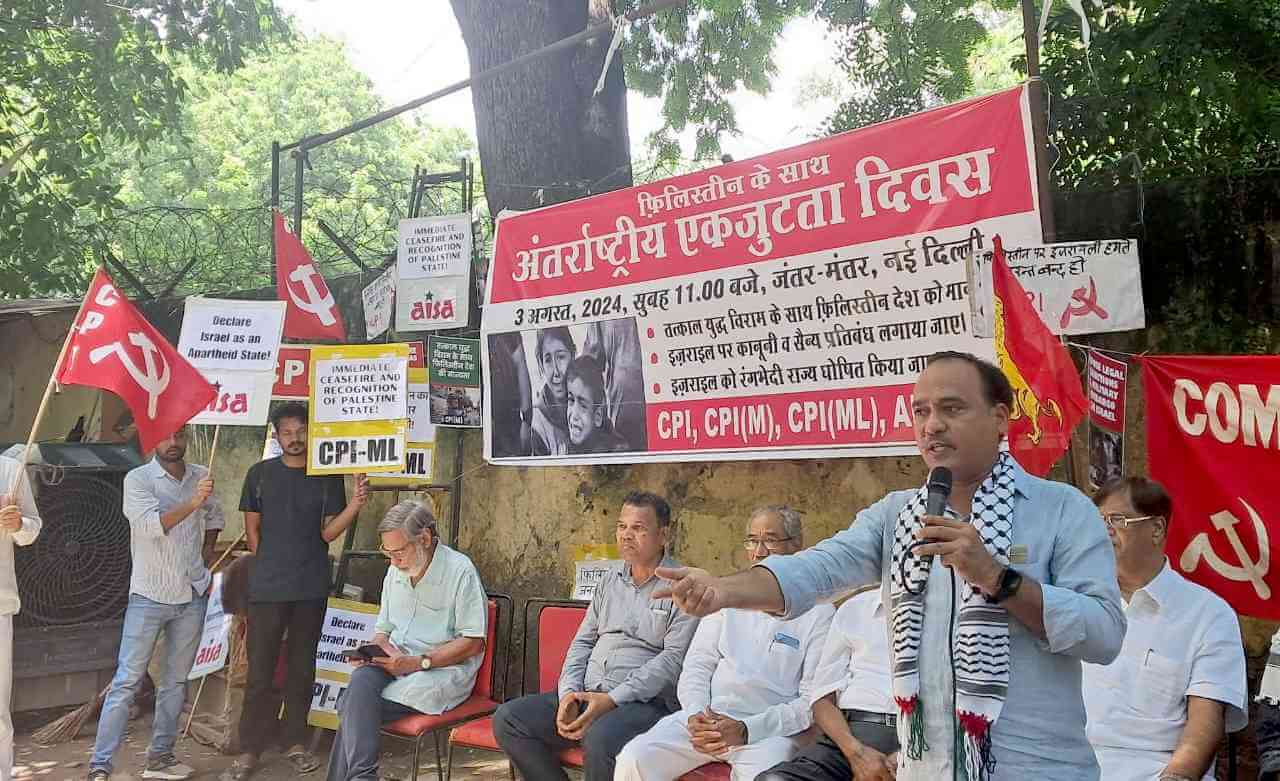 भारत की कम्युनिस्ट पार्टी (मार्क्सवादी-लेनिनवादी) लिबरेशन, भारतीय कम्युनिस्ट पार्टी और भारत की कम्युनिस्ट पार्टी (मार्क्सवादी) के द्वारा 3 अगस्त 2024 को अपने अखिल भारतीय आह्वान के तहत संयुक्त राज्य अमेरिका द्वारा समर्थित इजरायल द्वारा, गाजा पट्टी में किये जा रहे नरसंहार और अत्याचारों के खिलाफ तथा फिलिस्तीनी लोगों के साथ अपनी एकजुटता व्यक्त करते हुए प्रयागराज (उप्र) पत्थर गिरजा, सिविल लाईन्स स्थित धरनास्थल पर प्रदर्शन कर महामहिम राष्ट्रपति महोदया को सम्बोधित ज्ञापन जिलाधिकारी प्रयागराज के माध्यम से भेजा गया.