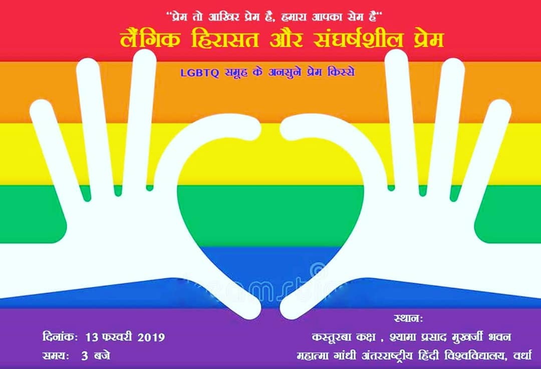 वेलेंटाइन दिवस की पूर्व संध्या पर महाराष्ट्र के वर्धा में ‘लैंगिक हिरासत और संघर्षशील प्रेम’ पर केन्द्रित एक कार्यक्रम आयोजित हुआ। कार्यक्रम में देश के विभिन्न हिस्सों से आए एलजीबीटीक्यू समुदाय के प्रतिनिधियों ने अपने प्रेम अनुभवों से संबंधित अनसुने किस्सों और उनका मौखिक इतिहास साझा किया। कार्यक्रम का आयोजन महात्मा गांधी अंतरराष्ट्रीय हिंदी विश्वविद्यालय के महात्मा गांधी फ्यूजी गुरुजी सामाजिक कार्य अध्ययन केंद्र के कस्तूरबा सभागार में आयोजित हुआ। कार्यक्रम के दौरान पूरा सभागार छात्रा-छात्राओं, शोधार्थियों व शिक्षकों से खचाखच भरा हुआ था। कार्यक्रम का संचालन स्त्री अध्ययन विभाग की शोधार्थी प्रीति ने किया। कार्यक्रम में स्वागत वक्तव्य केंद्र के निदेशक प्रो. मनोज कुमार ने दिया।