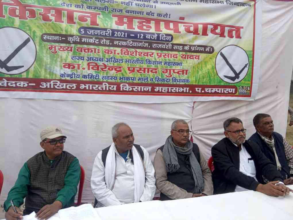 विगत 5 जनवरी 2021 को जिले के नरकटियागंज में किसान महापंचायत लगाकर तीनों कृषि विरोधी काले कानून को रद्द करने की मांग की गई और मोदी सरकार के द्वारा जनता के खिलाफ छेडे गये इस युद्ध के खिलाफ देश बचाने के लिये संघर्ष का संकल्प लिया गया.