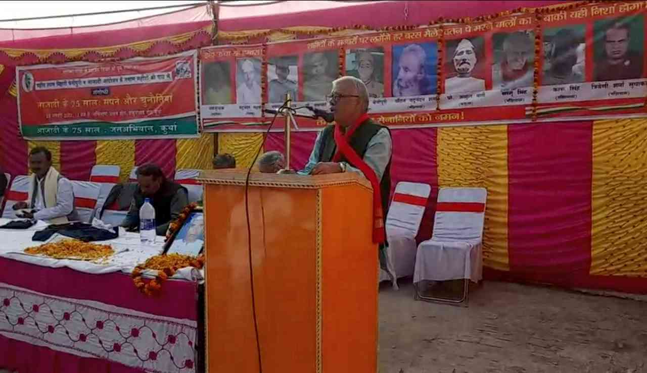 महात्मा गांधी के शहादत दिवस की पूर्व संध्या पर शहीद श्याम बिहारी बेनीपुरी एवं आजादी के तमाम शहीदों की याद में – ‘आजादी के 75 साल : सपने और चुनौतियां’ विषय पर अभिलाषा उत्सव हॉल में संगोष्ठी का आयोजन किया गया. संगोष्ठी का संचालन अखिल भारतीय किसान महासभा के राष्ट्रीय सचिव व भाकपा-माले राज्य स्थाई समिति के सदस्य डॉ. रामाधार सिंह ने किया. 1942 के शहीद वायजुजहक, यदुनंदन महतो, रामचरण यादव, प्रोफेसर रामप्यारे सिंह, श्याम बिहारी बेनीपुरी, पंडित यदुनंदन शर्मा, प्रो अब्दुल बारी, सत्यदेव शर्मा, कारू सिंह तथा उसी आंदोलन से जुड़े रहे त्रिवेणी शर्मा सुधाकर को श्रद्धांजलि दी गई. उसके पश्चात शहीदों के परिजनों को अंग वस्त्र प्रदान कर सम्मानित किया गया.