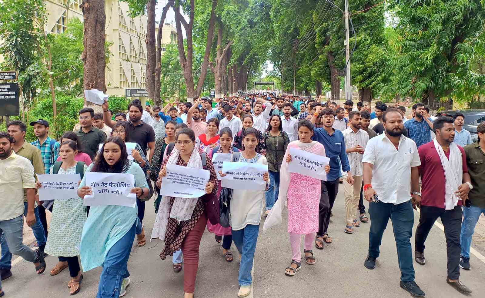 बायोमेट्रिक उपस्थिति प्रणाली के विरोध के अलावा, शोधार्थी गैर-नेट फेलोशिप की भी मांग कर रहे हैं. नेट परीक्षा में बैठने वाले 1% से भी कम छात्रा जेआरएफ के लिए पात्र होते हैं, जिससे अधिकांश शोधार्थी बिना किसी वित्तीय सहायता के रह जाते हैं. यह समर्थन न मिलने के कारण उनके लिए अपने शोध को जारी रखना कठिन हो जाता है. गैर-नेट शोधार्थी शैक्षणिक समुदाय में महत्वपूर्ण योगदान देते हैं और उन्हें वित्तीय सहायता मिलनी चाहिए जिससे वे अपने काम को वित्तीय कठिनाइयों के बिना जारी रख सकें। इस अनुदान के बिना, कई शोध को छोड़ने के लिए मजबूर होते हैं, जिससे विश्वविद्यालय में शैक्षणिक कार्य की गुणवत्ता और उत्पादन पर नकारात्मक प्रभाव पड़ता है.