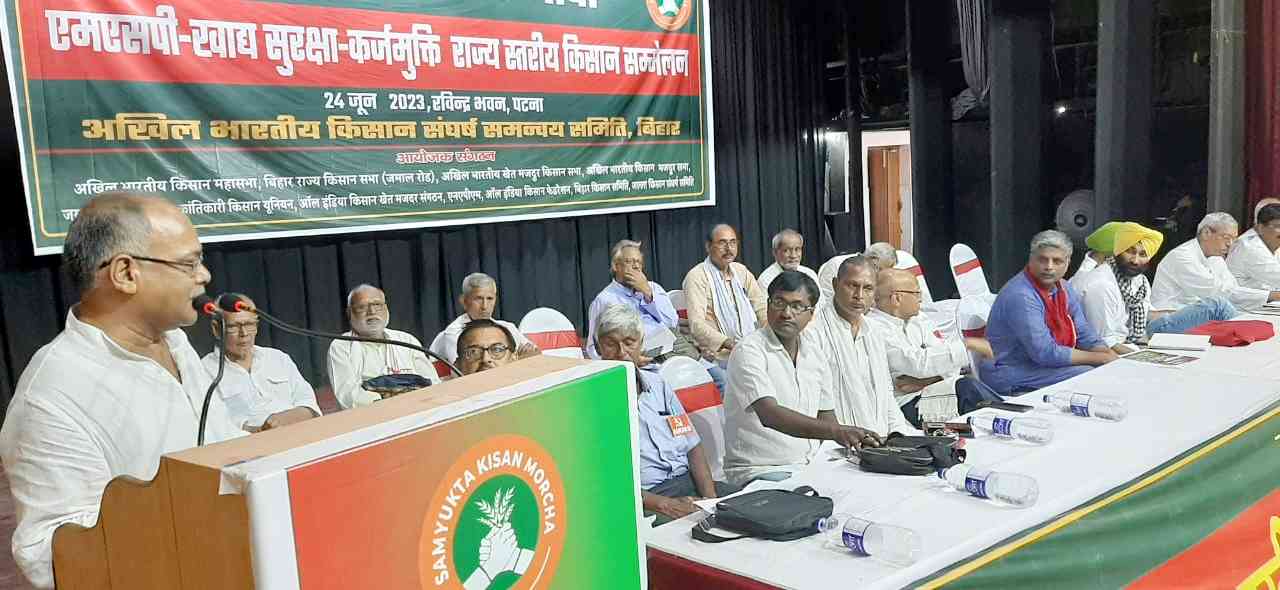संयुक्त किसान मोर्चा एवं अखिल भारतीय किसान संघर्ष समन्वय समिति के संयुक्त तत्वावधान में बिहार के प्रमुख किसान संगठनों ने पटना के रविन्द्र भवन में 24 जून 2023 को एक विशाल ‘एमएसपी-खाद्य सुरक्षा-कर्जमुक्ति’ सम्मेलन का आयोजित किया. सम्मेलन में बिहार के सभी जिलों से 12 सौ से अधिक किसान प्रतिनिधियों सहित करीब दर्जन भर राष्ट्रीय किसान नेता और राज्य के 11 किसान संगठनों के नेता शमिल हुए.