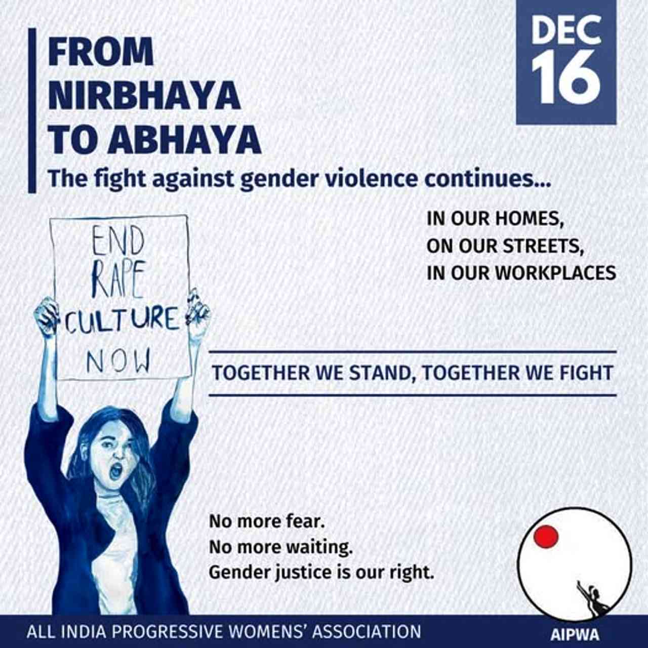 उस दिन दिल्ली में महिला संगठनों का संयुक्त कार्यक्रम है जिसमें ऐपवा पूरी भागीदारी करेगा. पश्चिम बंगाल में 14 दिसंबर को अभया से निर्भया तक की याद में कार्यक्रम होगा. अन्य जगहों पर भी हमें संयुक्त या स्वतंत्र रूप से कार्यक्रम होंगे.