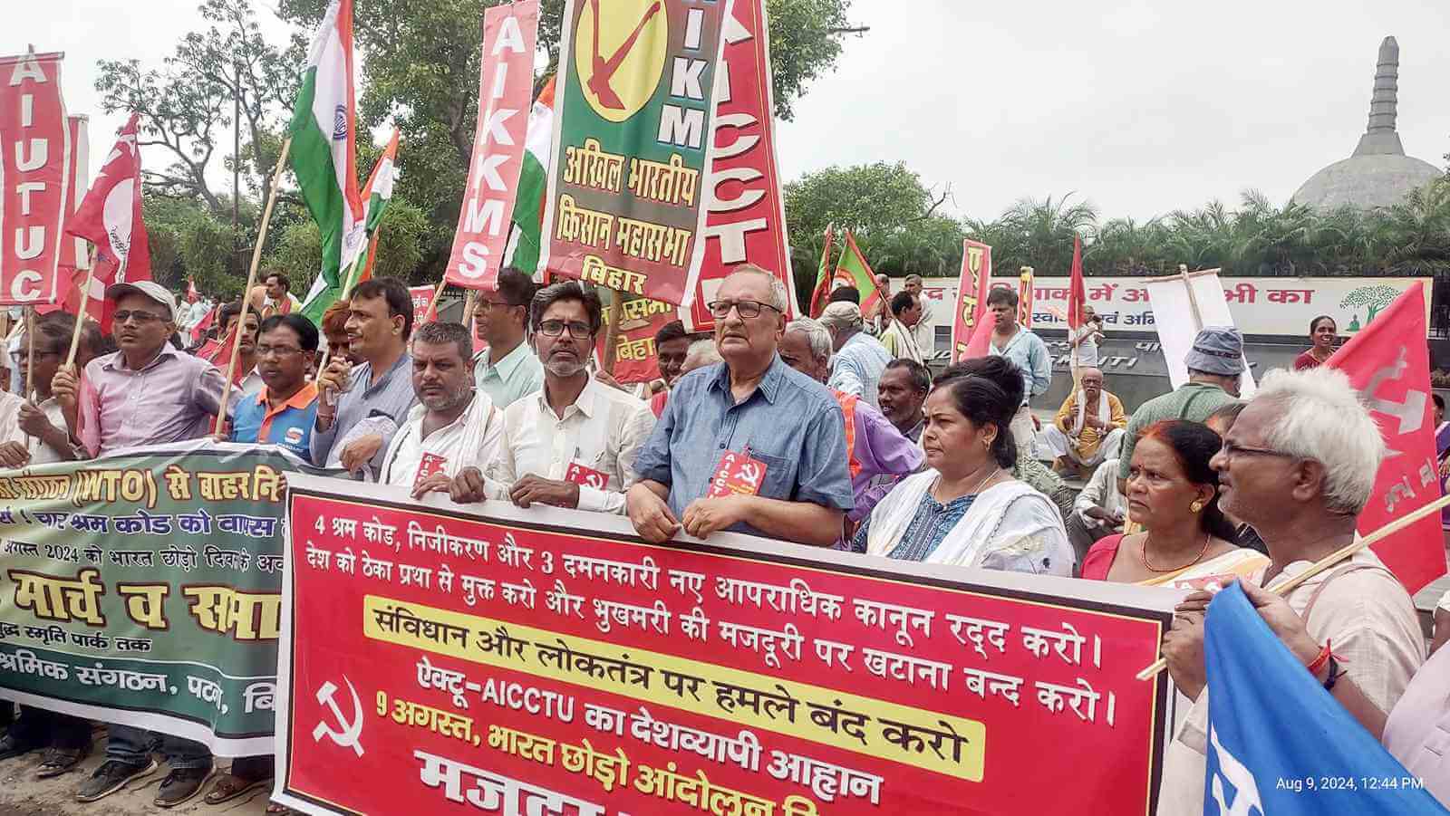 संयुक्त किसान मोर्चा एवं केन्द्रीय श्रमिक संगठनों के देशव्यापी आह्वान पर 9 अगस्त 2024 को ‘भारत छोड़ो दिवस’ के अवसर पर ‘बहुराष्ट्रीय कंपनियां भारत छोड़ो’, ‘भारत सरकार डब्ल्यूटीओ से बाहर निकलो’ के नारे के साथ पटना में सैकड़ों मजदूरों-किसानों ने विरोध मार्च आयोजित किया और सभा की.