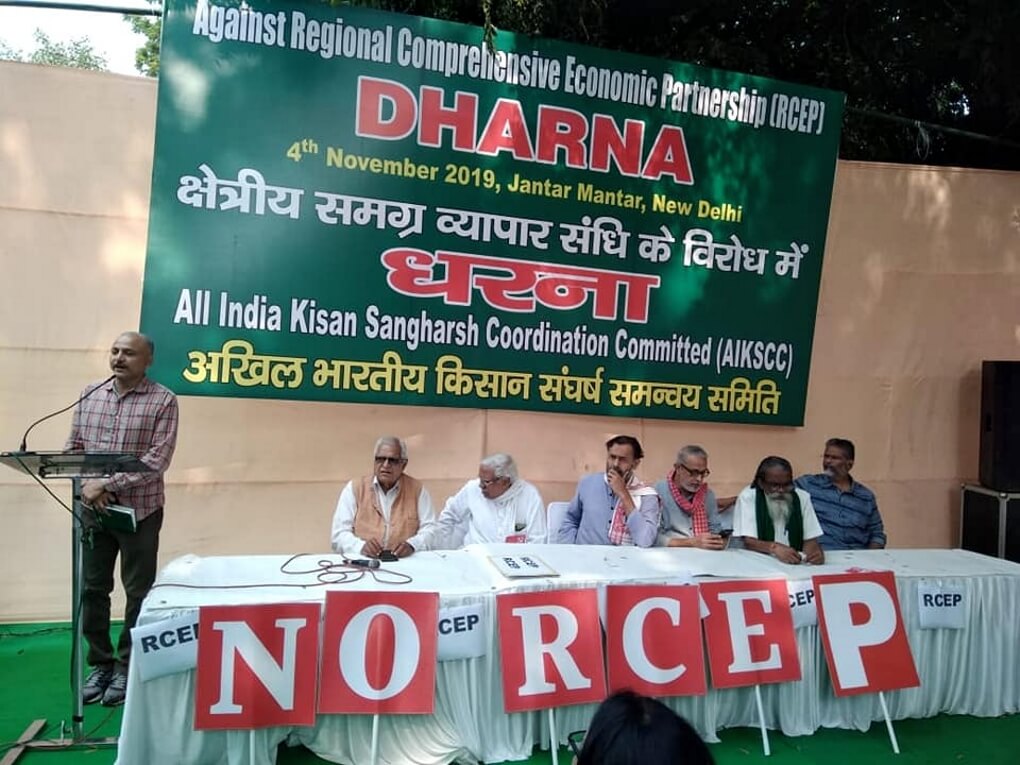 दिल्ली के जंतर-मंतर पर एक दिवसीय धरना दिया गया और आरसीईपी की प्रतियां जलाई गई. धरना स्थल पर सभा को अखिल भारतीय किसान सभा के हन्नान मौला, स्वराज्य अभियान के योगेन्द्र यादव, अखिल भारतीय किसान महासभा के राष्ट्रीय उपाध्यक्ष प्रेम सिंह गहलावत, अभीक साह, अयाकन्नू, कृष्णा प्रसाद, दिनेश अबरोल, अफसर जाफरी, रंजा सेन गुप्ता, संजीव आदि नेताओं ने सम्बोधित करते हुए कहा कि मोदी सरकार को किसानों के हित में आरसीईपी से बाहर आ जाना चाहिए.