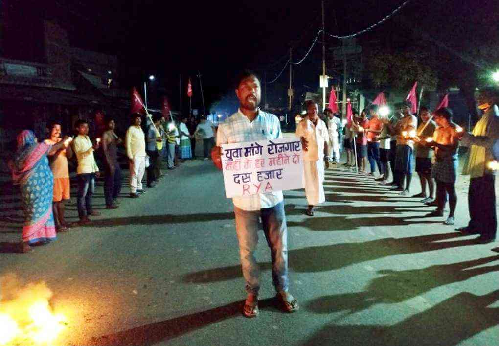 राजधानी पटना के चितकोहरा में आइसा नेता आकाश कश्यप की अगुआई में छात्रा-नौजवानों ने मोमबत्ती मार्च निकाला. दरभंगा व बेगूसराय में रोजगार के लिए टार्च व मोमबत्ती जलाते हुए कार्यक्रम किया गया.