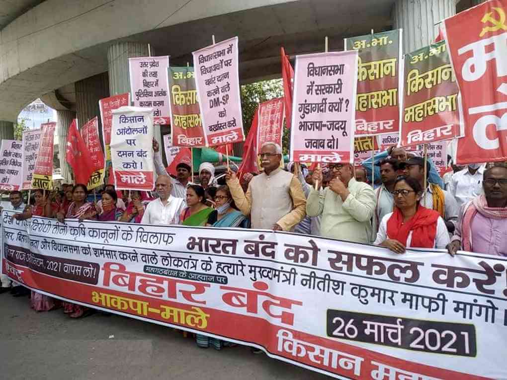 बिहार विधानसभा के अंदर लोकतंत्र की हत्या के विरोध में और इसके जिम्मेवार बिहार के मुख्यमंत्री नीतीश कुमार द्वारा बिहार की जनता से माफी मांगने की मांग पर विपक्षीे महागठबंधन ने 26 मार्च 2021 को बिहार बंद का आह्वान किया था. इसका असर सुबह से ही दिखने लगा. भाकपा(माले) कार्यकर्ता पूरे राज्य में सुबह से ही सड़कों पर उतर आए. दरभंगा व जहानाबाद में रेल परिचालन को ठप्प किया, बाजार बंद कराया और ‘जेपी-लोहिया की धिक्कार, शर्म करो नीतीश कुमार’ के नारों के साथ ‘बिहार सशस्त्रा बल अधिनियम-2021’ को बिहार की जनता पर थेपने से बाज आने को कहा. भाकपा(माले) व उसके जनसंगठनो -- अखिल भारतीय किसान महासभा, ऐक्टू व खेग्रामस के कार्यकर्ताओं ने बंद में बढ़-चढ़कर हिस्सा लिया.