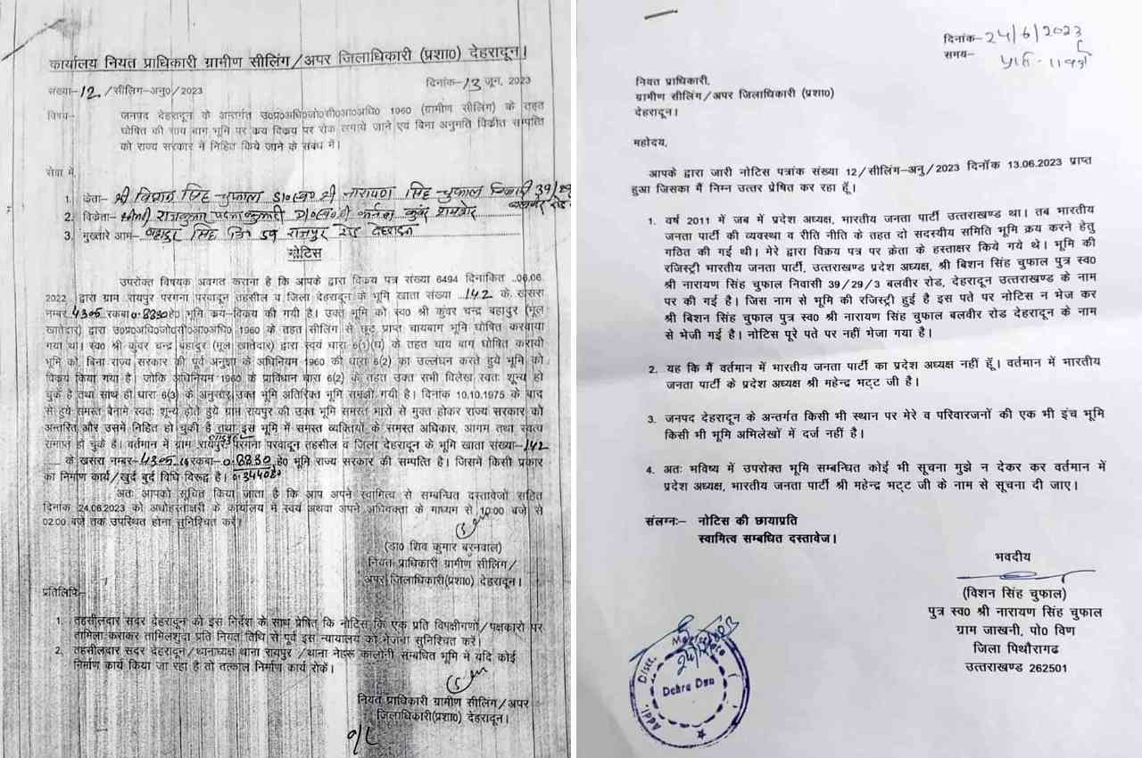 13 जून 2023 को देहरादून के अपर जिलाधिकारी और ग्रामीण सीलिंग के नियत प्राधिकारी डॉ. शिव कुमार बरनवाल ने भाजपा के पूर्व अध्यक्ष और वर्तमान विधायक बिशन सिंह चुफाल को एक नोटिस भेजा. नोटिस का लब्बोलुआब यह है कि देहरादून में रायपुर में जहां भाजपा के राज्य कार्यालय के लिए जमीन खरीदी गयी है, वह जमीन राज्य सरकार की संपत्ति है. 1975 के बाद उस जमीन के समस्त बैनामे शून्य हैं और उक्त जमीन पर किसी भी प्रकार का निर्माण कार्य गैरकानूनी है.