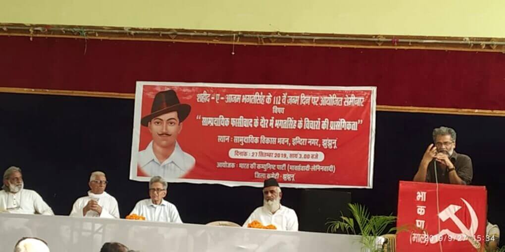 27 सितंबर को भगत सिंह के जन्म दिन के अवसर पर भाकपा(माले) ने ‘आज के भारत में भगत सिंह की प्रासंगिकता’ विषय पर झुंझुनू (राजस्थान) में एक जन सभा का आयोजन किया. इस सभा में भाकपा(माले) महासचिव दीपंकर भट्टाचार्य ने डा. घासी राम वर्मा – जो मूलतः झुंझुनू के रहने वाले गणितज्ञ और परोपकारी व्यक्ति हैं – को सम्मानित किया.