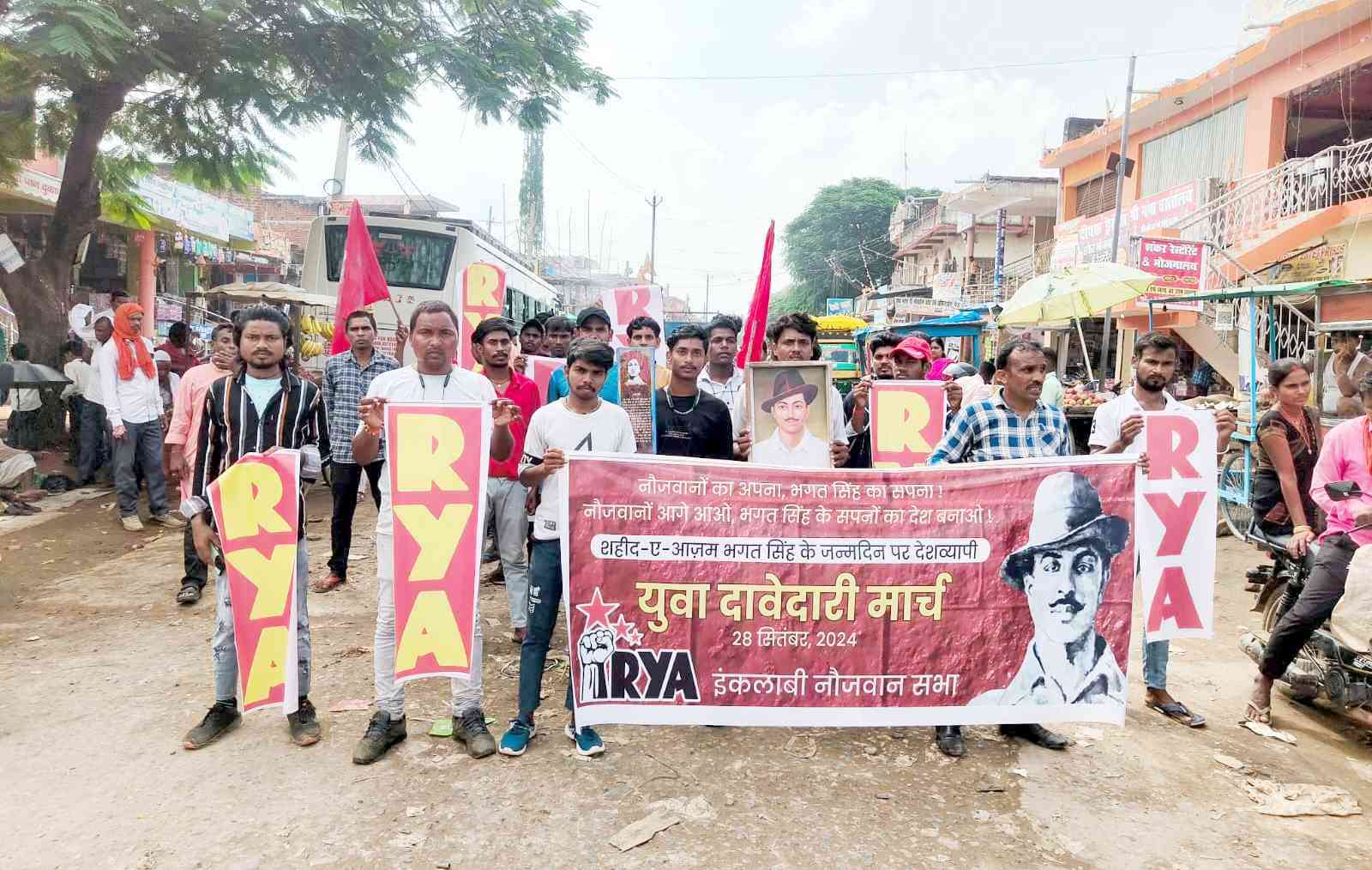 इंकलाबी नौजवान सभा (आरवाईए) द्वारा देशव्यापी आह्वान पर 28 सितंबर 2024 को शहीद-ए-आजम भगत सिंह की 117वें जन्मदिन पर ‘युवा दावेदारी मार्च’ का आयोजन किया गया. यह मार्च बिहार, झारखंड, उत्तर प्रदेश, दिल्ली, महाराष्ट्र, बंगाल, असम, पंजाब, हरियाणा, गुजरात, तमिलनाडु, सहित भारत के कई अन्य राज्यों के कई शहरों में आयोजित किया गया, जिसमें हजारों की संख्या में युवाओं ने भाग लिया इस अवसर पर भगत सिंह की प्रतिमाओं पर माल्यार्पण कर जगह-जगह नुक्कड़ सभाओं का आयोजन किया गया.