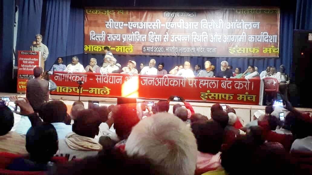5 मार्च 2020 को पटना के भारतीय नृत्य कला मंदिर में भाकपा(माले) और इंसाफ मंच द्वारा ‘सीएए, एनआरसी, एनपीआर विरोधी आंदोलन, दिल्ली राज्य प्रायोजित हिंसा से उत्पन्न स्थिति और हमारी कार्यदिशा’ विषय पर एक विचार गोष्ठी आयोजित की गई.