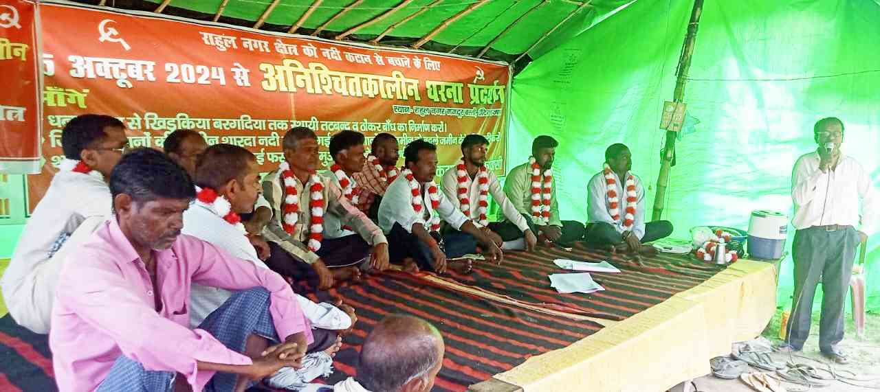पीलीभीत जिले की पूरनपुर तहसील के गांव राहुलनगर (मजदूर बस्ती) में शारदा नदी के बाढ़-कटाव पीड़ितों का 5 अक्टूबर 2024 से अनिश्चतकालींन धरना शुरू हुआ था जो 19 अक्टूबर से अनिश्चित कालीन क्रमिक भूख हड़ताल के रूप में आज भी जारी है. अनशन कारियों की मांग है कि धनारा घाट से खिरकिया तक पक्का तटबंध बनाया जाए, नदी कटान से कटी जमीन के बदले जमीन ढ़ी जाए व बाढ़-कटाव से बर्बाद हुई फसलों का मुआवजा दिया जाए, साथ ही, चैनलाइजेशन मशीन से कम से कम 5 किलोमीटर तक शारदा नदी के शिल्ट को साफ कर नदी को पुरानी धार में पहुंचाया जाए.