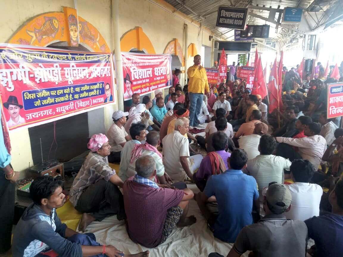 जयनगर (मधुबनी) में रेलवे के भूमि पर बसे सैंकड़ों गरीबों ने झुग्गी-झोपड़ी यूनियन के नेतृत्व में 15 अक्टूबर 2019 को रेलवे प्लेटफार्म पर ही धरना दिया और रेल प्रशासन के द्वारा तुगलकी फरमान के तहत झुग्गी-झोपड़ी उजाड़ने की नोटिस जारी करने के खिलाफ और झोपड़ी उजाड़ने से पहले वैकल्पिक व्यवस्था कर लोगों को बसाने की मांग की.