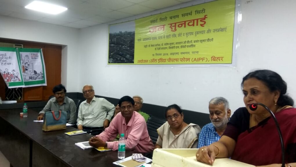 18 सितंबर 2019 को पटना के आइएमए हाॅल में ऑल इंडिया पीपल्स फोरम (एआईपीएफ) द्वारा जन सुनवाई का आयोजन किया गया. जन सुनवाई का विषय था, ‘स्मार्ट सिटी बनाम समर्थ सिटी’. स्मार्ट सिटी के नाम पर पटना केे अदालतगंज तालाब का सरकार द्वारा अतिक्रमण करने व पटना के शहरी गरीबों व फुटकर दुकानदारों पर अत्याचार के खिलाफ इस जन सुनवाई का आयोजन किया गया.