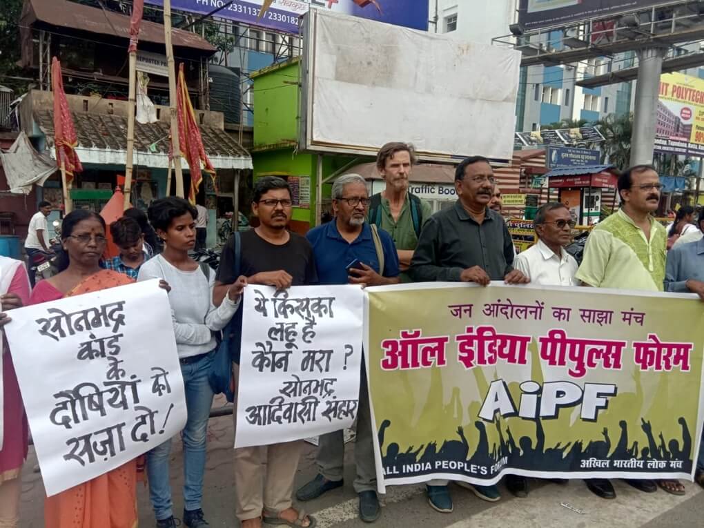 रांची के अल्बर्ट एक्का चैक पर सोनभद्र में आदिवासियों के जनसंहार के खिलाफ आल इंडिया पीपुल्स फोरम के आह्वान पर 22 जुलाई 2019 को विभिन्न सामाजिक जन संगठनों के प्रतिनिधियों ने नागरिक प्रतिवाद किया. कार्यक्रम को संबोधित करते हुए सभी वक्ताओं ने सोनभद्र आदिवासी जनसंहार कांड को देश के संविधान और लोकतंत्र पर हमला बताते हुए कहा कि वर्तमान सत्ताधारी दल के शासन में आदिवासियों और उनके जल-जंगल-जमीन के अधिकारों पर हमले बढ़े हैं. वर्तमान सरकार व उसके नेता जहां एक ओर आदिवासी प्रेम का ढोंग रचते हैं वहीं दूसरी ओर खुद इनके अधिकारों पर हमले करते हैं. उनके जंगल-जमीन की लूट को इन सरकारों ने बेलगाम बना दिया है. सोनभद्र कांड और इस पर देश के गृह मंत्री तथा आदिवासी मामलों के मंत्री की चुप्पी इसका खुला उदाहरण है. कार्यक्रम के माध्यम से सोनभद्र जनसंहार के ज़िम्मेवार सभी दोषियों को सजा देने, आदिवासियों को उनकी परंपरागत ज़मीनों का कानूनी पट्टे दिये जाने, आदिवासियों के अधिकारों पर हमले बंद किए जाने व विकास के नाम पर आदिवासियों को उजाड़ना बंद करने की मांगें की गईं.
