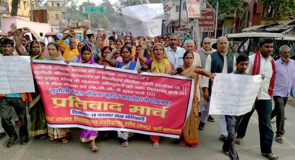 पूर्वी चंपारण के सुगौली कांड, जिसमें 4 लोगों की मौत हो गई और कई अन्य मजूदर बुरी तरह घायल हो गए, के खिलाफ विगत 19 नवंबर को बिहार राज्य विद्यालय रसोईया संघ, ऐक्टू, ऐपवा व भाकपा(माले) के बैनर तले राज्य के विभिन्न हिस्सों में प्रतिवाद हुआ. पटना में मध्यान्ह भोजन योजना समिति के कार्यालय के समक्ष जुझारू प्रदर्शन किया गया और उसके डायरेक्टर को मांगों से संबंधित ज्ञापन सौंपा गया. मांग पत्र में सुगौली कांड के दोषियों को अविलंब गिरफ्तार करने, घटना की न्यायिक जांच कराने, नवप्रयास एनजीओ को स्थाई रूप से प्रतिबंधित करने, मृतक मजदूरों के परिजनों को 10-10 लाख रु. मुआवजा देने, हर एक परिवार से एक सदस्य को नौकरी देने आदि मांगें शामिल थीं. कार्यक्रम का नेतृत्व रसोइया संघ की महासचिव सरोज चौबे, ऐक्टू के बिहार राज्य महासचिव आर एन ठाकुर, ऐक्टू के राज्य सचिव रणविजय कुमार, ऐपवा की राज्य सचिव शशि यादव, बिहार राज्य विद्यालय रसोईया संघ की राज्य सचिव सोना देवी व रसोइया संघ की कोषाध्यक्ष राखी मेहता, राज्य पार्षद रीता देवी, पटना जिला सचिव माधुरी गुप्ता, दमयंती सिन्हा, मधु आदि ने किया. इसके पूर्व पटना स्टेशन स्थित बुद्ध स्मृति पार्क से प्रदर्शन निकला था और डाकबंगला, कोतवाली होते हुए मध्यान्ह भोजन समिति के दफ्तर पहुंचा था.