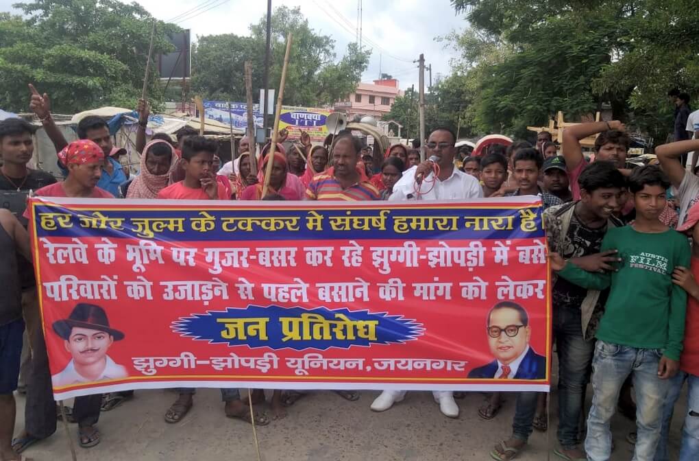 कोई वैकल्पिक व्यव्स्था किए बिना ही रेलवे प्रशासन द्वारा जयनगर में रेलवे के भूमि पर झुग्गी-झोंपड़ी डाल कर जीवन यापन कर रहे लोगों को उजाड़ने की नोटिस जारी करने के विरोध में विगत 12 सितंबर 2019 को प्रतिवाद आयोजित हुआ. इसके तहत झुग्गी झोपड़ी यूनियन के अनुमंडल सचिव का. भूषण सिंह के नेतृत्व में शहर के मुख्य मार्ग से होते हुए मार्च निकाला गया और रेलवे स्टेशन चौक पर सभा आयोजित की गई.