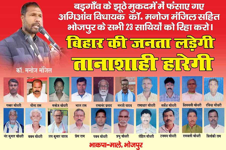 हत्या के एक कथित 9 साल पुराने मामले में दलित समाज से आने वाले तेजतर्रार व जनता के लोकप्रिय नेता, भोजपुर के अगिआंव से भाकपा-माले विधायक मनोज मंजिल और उनके अन्य 22 साथियों - गुड्डु चौधरी, चिन्ना राम, भरत राम, प्रभु चौधरी, रामाधार चौधरी, गब्बर चौधरी, जयकुमार यादव, नंदू यादव, चनरधन राय, नंद कुमार चौधरी, मनोज चौधरी, टनमन चौधरी, सर्वेश चौधरी, रोहित चौधरी, रविन्द्र चौधरी, शिवबाली चौधरी, रामबाली चौधरी, पवन चौधरी, प्रेम राम, त्रिलोकी राम और बबन चौधरी को आरा व्यवहार न्यायालय द्वारा सश्रम आजीवन कारावास की सजा सुनाई गई है. सांप्रदायिक-सामंती ताकतों ने भोजपुर में दलित-गरीबों के आंदोलन को कमजोर करने के लिए कभी उनका बर्बर जनसंहार रचाया तो कभी राजनीतिक साजिश करके उन्हें झूठे मुकदमों में फंसाया. दलित-गरीबों के आंदोलन को रोकने का यह उनका चिरपरिचित तरीका रहा है. यह सजा बिहार में भाजपाईयों द्वारा सत्ता हड़प के तुरत बाद हुई. तत्काल ही मनोज मंजिल की विधानसभा सदस्यता रद्द कर दी गई. मोदी शासन में जिस प्रकार से विरोध की हर आवाज को खामोश कर देने की साजिशें चल रही हैं, यह न्यायिक संहार उसका चरम उदाहरण है. उसी न्यायालय ने भाकपा-माले नेता का. सतीश यादव हत्याकांड के मुख्य आरोपी रिंकू सिंह को बाइज्जत बरी करने का काम किया था. दलित-गरीबों के हत्यारों की रिहाई और जनांदोलनों के नेताओं को सजा! इसी अन्याय के खिलापफ लड़ने का नाम है - भोजपुर.