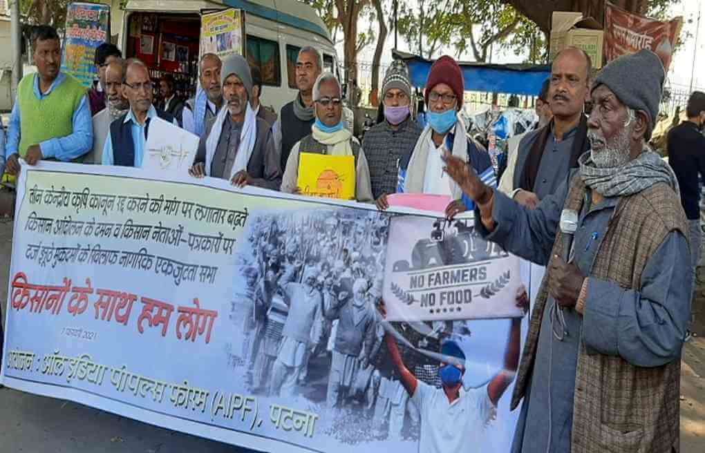 एआइपीएफ ने विगत 7 फरवरी 2021 को पटना के शहीद भगत सिंह चौक (गांधी मैदान) पर ‘किसान आंदोलन के साथ हमलोग’ कार्यक्रम आयोजित किया. भाकपा(माले) के पूर्व सांसद व वरिष्ठ वामपंथी नेता का. रामेश्वर प्रसाद ने अपने संबोधन के दौरान तीन कृषि कानूनों की चर्चा करते हुए कहा कि मोदी सरकार देश में लोकतंत्र को समाप्त करने पर अमादा है. किसानों का यह आंदोलन सिर्फ कृषि कानूनों के खिलाफ ही नहीं है, बल्कि लोकतंत्र, संविधान और देश बचाने के साथ ही, लोगों का अस्तित्व बचाने का भी संघर्ष है. आपदा की घड़ी में मोदी सरकार ने देश के सार्वजनिक प्रतिष्ठानों को पूंजीपतियों के हाथों बेचना शुरू कर दिया. हद तो तब हो गई जब रेल, एयरपोर्ट, अस्पताल आदि का निजीकरण करने के बाद खेती-किसानी को भी मोदी सरकार ने अंबानी-अडानी जैसे काॅरपोरेट घरानों को बेचने की तैयारी कर ली. जैसे-तैसे संसद से नया कृषि कानून पारित करवा दिया जिसके खिलाफ देश के किसान जीने-मरने की हद तक आंदोलन कर रहे हैं. जब अनाज उपजाने वाला ही नहीं बचेगा तो देश कैसे बचेगा?