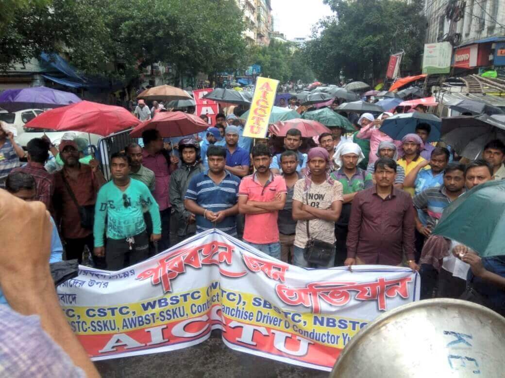 धमकियों और विरोधी प्रचार अभियानों को धता बताते हुए मजदूरों ने, मुख्यतः विभिन्न फ्रेंचाइजी कंपनियों द्वारा नियुक्त ठेका मजदूरों ने भीषण वर्षा के बावजूद दृढ़संकल्प के साथ गोलबंदी की और जोशीला व जुझारू प्रतिवाद मार्च संगठित किया. मार्च सुबोध मल्लिक स्क्वायर से शुरू होकर राज्य परिवहन विभाग के मुख्यालय तक गया.
