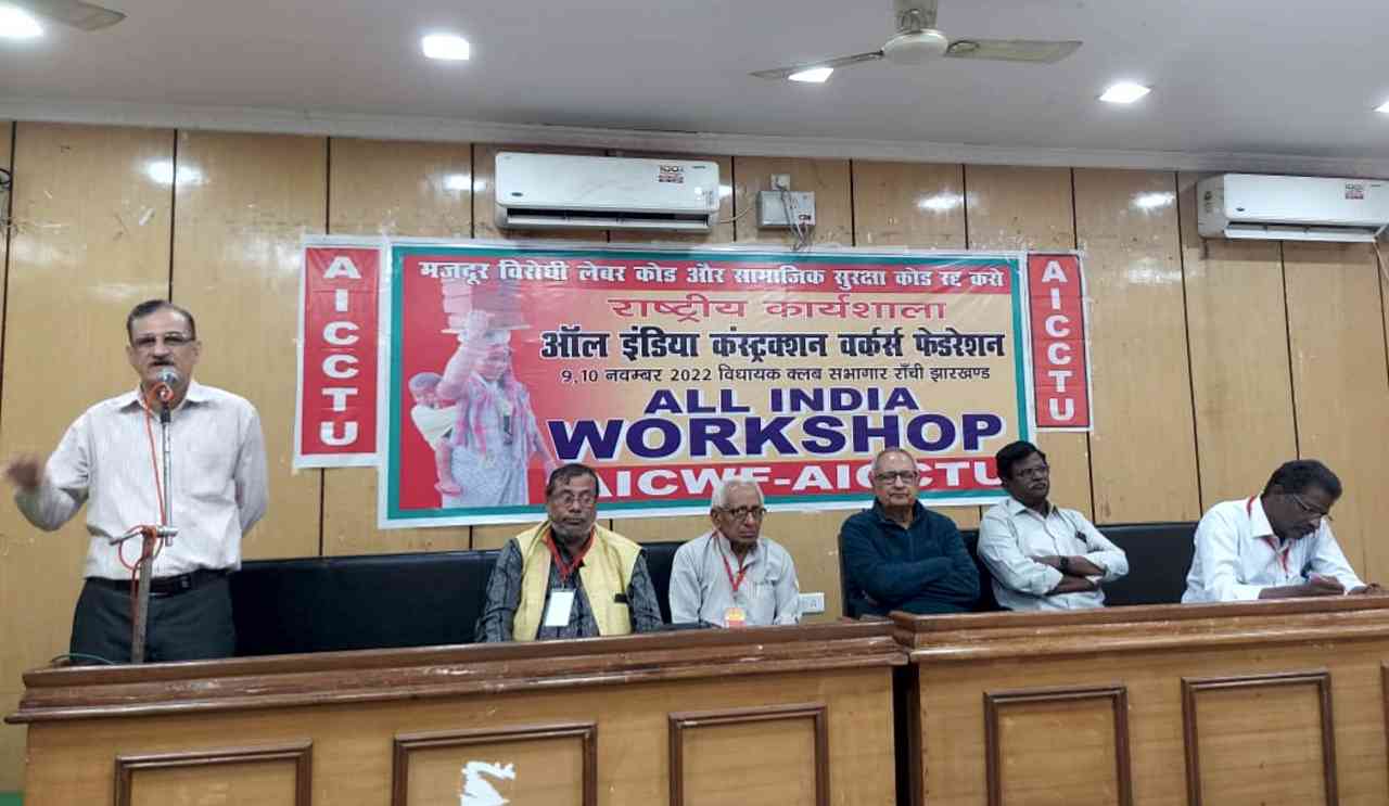 मोदी के नेतृत्व वाली भाजपा सरकार की मजदूर वर्ग पर हमलों की पृष्ठभूमि में ऑल इंडिया कंस्ट्रक्शन वर्कर्स फेडरेशन (एआइसीडब्ल्यूएफ) ने अपनी पहली राष्ट्रीय कार्यशाला का आयोजन 9-10 नवम्बर 2022 को रांची में किया. कार्यशाला में लेबर कोड सहित कल्याण बोर्डों को भंग करने और इसकी स्थापना के बाद से इसके अनुभवों का जायजा लिया जाना शामिल रहा.