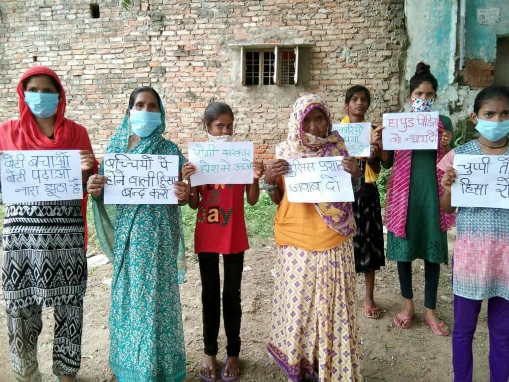 हापुड़ में छह वर्षीय बच्ची के साथ बलात्कार व बुलंदशहर की मेधावी छात्रा सुदीक्षा भाटी की छेड़खानी के चलते सड़क दुर्घटना में छह अगस्त को हुई मौत के दोषियों की गिरफ्तारी की मांग को लेकर महिला संगठनों ने लखनऊ व अन्य जिलों में 11 अगस्त को घरों से प्रतिवाद किया.