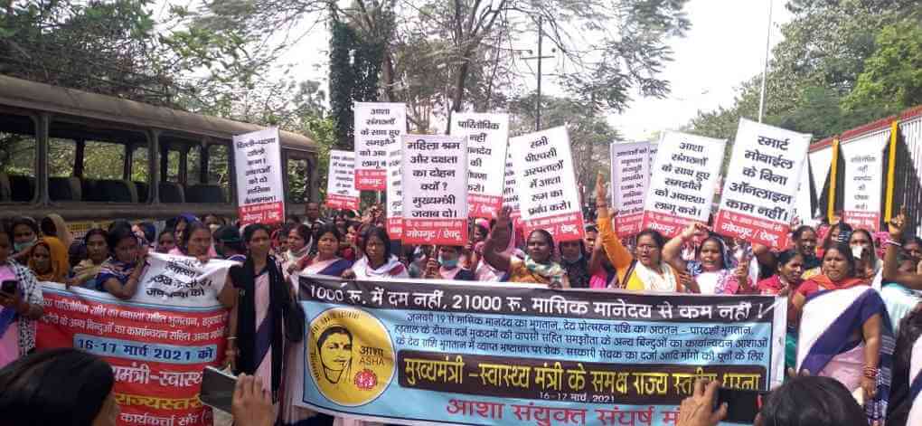 नीतीश सरकार की वादाखिलाफी, हकमारी व सरकारी उपेक्षा से आक्रोशित राज्य की हजारों आशा कार्यकर्ताओं ने विगत 16-17 मार्च को बिहार विधानसभा के समक्ष गर्दनीबाग, पटना में दो दिवसीय महाधरना आयोजित किया. आशा कर्मियों ने ‘1000 में दम नही, 21000 रुपये मासिक मानदेय से कम नहीं’, ‘पारितोषिक नहीं, मासिक मानदेय देना होगा’, ‘आशा को सरकारी कर्मी घोषित करना होगा’, ‘सभी आशाओं का सेवा अभिलेख निर्माण करना होगा’, ‘सभी काम का अलग-अलग मेहनताना का ससमय भुगतान करो’ आदि मांगों को बुलंद किया. यह महाधरना कार्यक्रम आशा संयुक्त संघर्ष मंच के बैनर तले आयोजित हुआ जिसमें राज्य के सभी जिलों से लगभग दस हजार आशाकर्मियों ने हिस्सा लिया.