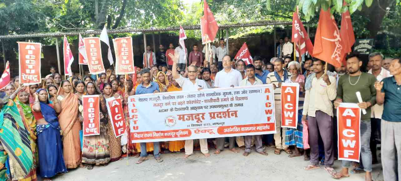 ऑल इंडिया कंस्ट्रक्शन वर्कर्स फेडरेशन (एआइसीडब्लूएफ) के देशव्यापी आह्वान पर, मजदूर वर्ग पर बढ़ते फासीवादी-काॅरपोरेट हमले और मजदूरों के निबंधन व सामाजिक सुरक्षा में व्याप्त भ्रष्टाचार के खिलाफ 14 सितम्बर को ऐक्टू से सम्बद्ध बिहार राज्य निर्माण मजदूर यूनियन व असंगठित कामगार महासंघ से जुड़े सैकडों मजदूरों ने भागलपुर उपश्रमायुक्त कार्यालय के समक्ष जोरदार प्रदर्शन किया.