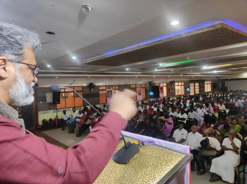 90% உடல் உறுப்புகள் பாதிக்கப்பட்டு சக்கர நாற்காலியில் இருக்கும் பேராசிரியர் சாய்பா பாவை நீதிமன்றம் விடுதலை செய்தது. ஆனால், உச்சநீதி மன்றம் அவர் உடல் ஊனமுற்றவராக இருக்கலாம், ஆனால் அவர் மூளை வேலை செய்கிறது. மனித உடலில் மூளை தான் மிகவும் ஆபத்தான உறுப்பு என்று சொல்லி விடுதலையை நிறுத்தி வைத்து விட்டது. அவர்கள் சொல்வது சரிதான் 130 கோடி மக்களின் மூளை வேலை செய்ய ஆரம்பித்தால், நாங்கள் பாசிச ஆட்சியை ஏற்றுக்கொள்ள மாட்டோம் என்று சொன்னால், இந்த ஆட்சி முடிவுக்கு வரும். இந்த மாநாடு வெற்றியடைய வாழ்த்துகிறேன். உருவாக்கப் பட்டுள்ள இந்த ஒற்றுமை இன்னும் வலுவாக்கப் பட வேண்டும். விவசாயிகள் போராட்டம் போல, குடியுரிமைச் சட்ட எதிர்ப்புப் போராட்டம் போல, வேலை கேட்டு மாணவர் இளைஞர் பெண்கள் நடத்தி வரும் போராட்டம் போல, இன்னும் அதிகரித்த அளவிலான போராட்டங்கள் தேவை. போராட்டங் களால்தான் இந்த மக்கள் விரோத ஆட்சியை அப்புறப்படுத்த முடியும். அத்தகைய போராட்டங்களை கட்டியமைத்திட உறுதியேற்போம்.