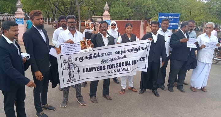 நாடு முழுவதும் குறிப்பாக பாஜக ஆளும் மாநிலங்களில் அதிலும் குறிப்பாக சாமியார் யோகி ஆதித்யாநாத் ஆட்சியிலிருக்கும் உத்தரப்பிரதேசத்தில் அரசுக்கு எதிராக எதிர்ப்புக்குரல் கொடுக்கும் இஸ்லாமிய மக்களின் வீடுகளை சட்டவிரோதமாக இடித்துத் தள்ளுகிறது அரசு. கேட்டால் விதிகள் மீறி கட்டப்பட்டதாகச் சொல்கிறது. விதிகள் மீறி கட்டப்பட்ட எல்லா கட்டிடங்களும் இப்படி இடிக்கப்படுவதில்லை. சமீபத்தில் ஜவஹர்லால் நேரு பல்கலைக் கழகத்தில் பயிலும் மாணவி அப்ரின் பாத்திமா, அரசுக்கு எதிராகக் குரல் கொடுத்தார் என்பதற்காக அவரின் வீட்டை புல்டோசர் கொண்டு இடித்துத் தரை மட்டம் ஆக்கி விட்டது யோகி அரசு. இது நாஜிக்கள் செய்த அச்சுறுத்தல் வேலை. ஒரு பக்கம் ஆட்சியில் உள்ள பாஜக சங்கிகளே வெறுப்பு அரசியலை தூண்டி விடுவதும் இன்னொரு பக்கம் அதற்கு எதிராகக் குரல் கொடுப்பவர்களின் வீடுகளை இடித்துத் தரை மட்டமாக்கி நடுவீதியில் நிறுத்தும் மோ(ச)டி மந்திரத்தை கையில் எடுத்துள்ளது மோடி-ஷா-யோகி அரசு. ஆகையால் இந்திய நாட்டின் அரசியலமைப்பு சட்டம் காக்கப்பட வேண்டும், வெறுப்பு அரசியல் உடனடியாக நிறுத்தப்பட வேண்டும், சிறுபான்மையினர் மீது குறிப்பாக இஸ்லாமியர் மீது புல்டோசர் தாக்குதல் நடத்தப்படுவது நிறுத்தப்பட வேண்டும் என்று வலியுறுத்தி சமூகநீதிக்கான வழக்கறிஞர்கள் சார்பாக நெல்லை மாவட்ட நீதிமன்றத்தின் முன்பு 17.6.2022 அன்று வழக்கறிஞர் ஜி.ரமேஷ் தலைமையில் ஆர்ப்பாட்டம் நடைபெற்றது. ஆர்ப்பாட்டத்தில் மூத்த வழக்கறிஞர் ராமநாதன், நெல்லை வழக்கறிஞர் சங்க முன்னாள் செயலாளர் ப.செந்தில்குமார், வழக்கறிஞர்கள் கு.பழனி, அப்துல் நிஜாம், ஆரிப், தமிழ்செல்வி, சுஜிதா, சுசிலா, அப்துல் ஜப்பார், பிரபாகர், பேச்சிமுத்து, இந்துமதி, அக்மல் கசாலி உட்பட அனைத்திந்திய நீதிக்கான வழக்கறிஞர்கள் சங்கம்(AILAJ), அகில இந்திய வழக்கறிஞர்கள் சங்கம் (AILU) அமைப்புகளின் வழக்கறிஞர்களும் கலந்து கொண்டனர்.