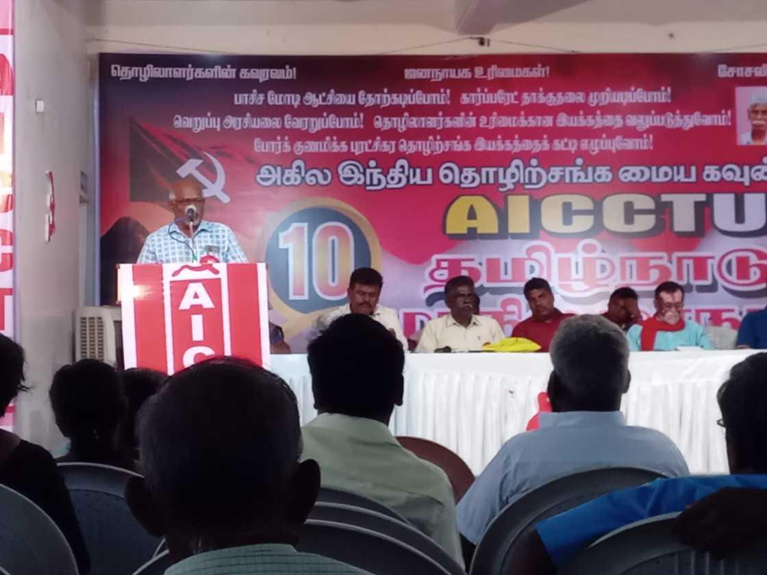 அகில இந்திய தொழிற்சங்க மையக் கவுன்சில் (ஏஐசிசிடியு), தமிழ்நாடு 10ஆவது மாநில மாநாடு 2023 டிசம்பர் 16-17 தேதிகளில் கரூர், பசுபதி பாளையம், டி.பி.மகாலில் தோழர்.என்.கே.நடராஜன் நினைவரங்கத்தில், தோழர் சுகுந்தன் நினைவு மேடையில் நடைபெற்றது. மாநாட்டுக் கொடியை ஏஐசிசிடியு மாநிலச் செயலாளர் தோழர் திருநாவுக்கரசு ஏற்றினார். தொடர்ந்து தியாகிகள் நினைவுத் தூணிற்கு தலைவர்கள் அஞ்சலி செலுத்தினார்கள். முதல் நாள் நடைபெற்ற பொது அமர்விற்கு ஏஐசிசிடியு மாநிலத் தலைவர் தோழர் த.சங்கர பாண்டியன் தலைமை தாங்கினார். ஏஐசிசிடியு மாநிலப் பொதுச் செயலாளர் தோழர் கே.ஞான தேசிகன் அஞ்சலித் தீர்மானத்தை முன்வைத்தார். ஏஐசிசிடியு மாநிலத் துணைத் தலைவர் தோழர் பால்ராஜ் வரவேற்புரையாற்றினார். ஏஐசிசிடியு அகில இந்திய தலைவர் தோழர் வீ.சங்கர், பொதுச் செயலாளர் தோழர் ராஜுவ்டிம்ரி சிறப்புரையாற்றி னார்கள். மேலும் தொழிலாளர் முன்னேற்றச் சங்கப் பேரவை துணைச் செயலாளர் தோழர் சு.பாண்டியன்,ஏஐடியுசி மாநிலத் தலைவர் தோழர் எஸ்.காசிவிஸ்வ நாதன், சிஐடியு மாநில உதவிப் பொதுச் செயலாளர் தோழர் வி.குமார், ஹெச்எம்எஸ் மாநிலத் தலைவர் திரு மு.சுப்பிரமணியன் ஏஐயூடியுசி மாநிலக் குழு உறுப்பினர் தோழர் சாய்குமார், உழைக்கும் மக்கள் மாமன்ற தொழிற்சங்க துணைத் தலைவர் தோழர் சம்பத், தொழிலாளர் விடுதலை முன்னணி மாநில அமைப்பாளர் தோழர் பேரறிவாளன், ஐஎன்டியுசி கரூர் மாவட்ட கௌரவத் தலைவர் திரு. பேங்க் சுப்ரமணியன், விவசாயிகள் போராட்ட முன்னணி யின் மாநில ஒருங்கிணைப்பாளர் தோழர் பாலகிருஷ்ணன் ஆகியோர் கலந்து கொண்டு வாழ்த்துரை வழங்கினார்கள். ஏஐசிசிடியு மாநிலச் செயலாளர் தோழர் கே.பாலசுப்பிரமணியன் தீர்மானங்களை முன்வைத்தார். மாநிலச் செயலாளர் தோழர் வேல்முருகன் நன்றி கூறினார். 16ம் தேதி மதிய உணவிற்குப் பின்னர் பிரதிநிதிகள் மாநாடு துவங்கியது. தோழர்கள் இரணியப்பன், பாலசுப்பிர மணியன், பால்ராஜ், கிருஷ்ணவேணி, வேல்முருகன், முத்து, மதியழகன் ஆகிய தலைமைக்குழு தோழர்கள் மாநாட்டை நடத்தினார்கள். தோழர்கள் வேல் முருகன், வெங்கடாச்சலம், கணேசன் ஆகியோர் உதவிக்குழுவாகச் செயல்பட்டனர்.