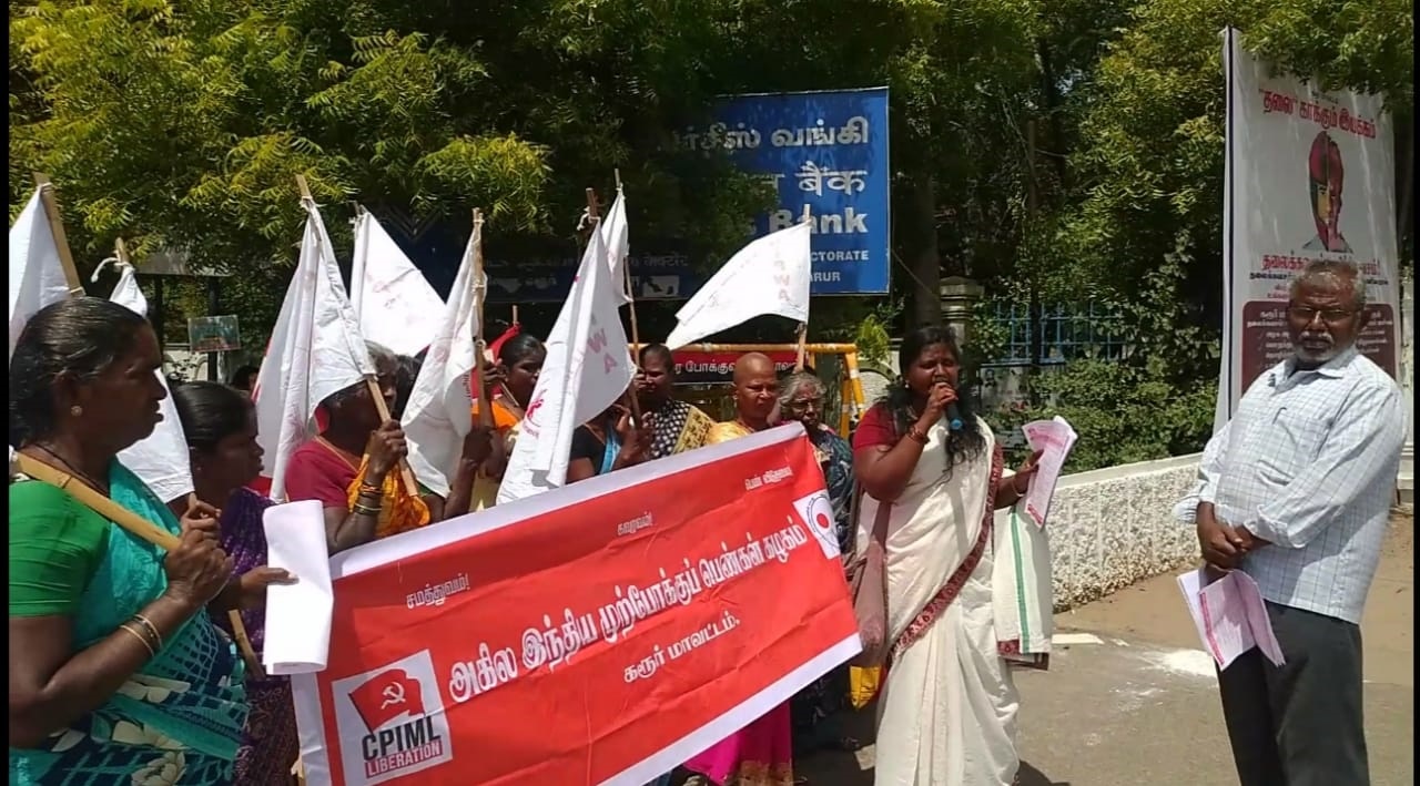 கரூர் மாவட்ட ஆட்சியர் அலுவலகம் முன்பாக, 27.6.2022 அன்று அகில இந்திய முற்போக்கு பெண்கள் கழகம் சார்பாக நடைபெற்ற ஆர்ப்பாட்டத்திற்கு மாவட்ட அமைப்பாளர் தோழர் பிலோமினா தலைமையேற்று கண்டன உரையாற்றினார். தோழர் ஜீவரத்தினம் முன்னிலை வகித்தார். இகக(மாலெ) மாவட்டக் குழு உறுப்பினர் தோழர் வி.சக்திவேல், அகில இந்திய மாணவர் கழக மாவட்ட அமைப்பாளர் தோழர் மெஜோ வாழ்த்துரை வழங்கினர். இகக (மாலெ) மாவட்டச் செயலாளர் மு.இராமச்சந்திரன் கண்டன முழக்கங்கள் எழுப்பி உரையாற்றினார். இகக(மாலெ) மாவட்ட அமைப்புக்குழுத் தோழர்கள் சரவணன், ராஜு மற்றும் மதியழகன் கலந்துகொண்டனர். தோழர் கருப்பாத்தாள் ஆகியோர் நன்றி கூறினார்.