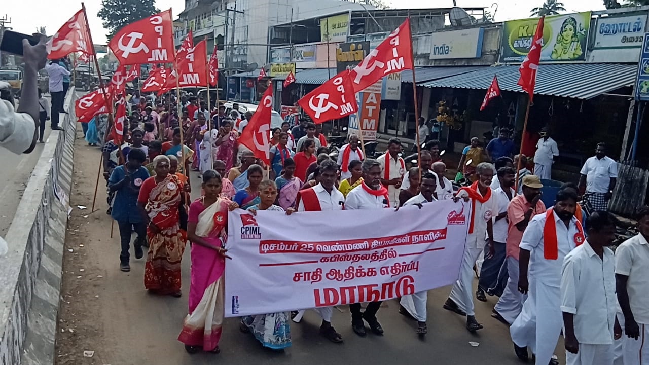 25.12.2021 அன்று கீழ் வெண்மணி நாளில் தஞ்சாவூர் மாவட்டம் கபிஸ்தலத்தில் இகக (மாலெ), அயர்லா, நீதிக்கான மக்கள் இயக்கம் சார்பாக சாதி ஆதிக்க எதிர்ப்பு மாநாடு நடத்தப்பட்டது. அன்று காலை 10.30 மணிய ளவில் கபிஸ்தலம் ஆற்றுப் பாலத்தில் இருந்து சிபிஐஎம்எல் தஞ்சை மாவட்டச் செயலாளர் தோழர் கண்ணையன் தலைமையில் ஊர்வலம் துவங்கி, கபிஸ்தலம் கிருஷ்ணா மஹால் வந்த டைந்தது. அதன் பின்னர் மாநாடு துவங்கியது. முதலில் தியாகிகளுக்கு அஞ்சலி செலுத்தப் பட்டது. தோழர் கண்ணையன் மாநாட்டுக்குத் தலைமை தாங்கினார். சிவகங்கை, புதுக் கோட்டை, நாகப்பட்டினம் ஆகிய மாவட்டங் களில் இருந்து பெண்களும் ஆண்களும் பங்கேற் றனர். மாநாடு இரண்டு அமர்வாக நடத்தப் பட்டது. அமர்வுகளின் இடையே புரட்சிகரப் பாடல்கள் பாடப்பட்டன. நீதிக்கான மக்கள் இயக்கத்தின் மாநில ஒருங்கிணைப்பாளர் தோழர் சிம்சன் துவக்க உரையாற்றினார். அடுத்தடுத்து முனைவர் அரசு முருகு பாண்டியன், பேராசிரி யர்கள் உ.பிரபா கரன், கோச்சடை ஆகியோர் உரையாற்றினர். இம்மாநாடு திருவைக்காவூரில் நடந்த தலித் ஒடுக்குமுறை மற்றும் கபிஸ்தல காவல்துறை சார் ஆய்வாளரின் தலித் விரோதப் போக்கின் பின்புலத்தில் நடத்தப்பட்டதை பேராசிரியர்கள் சுட்டிக் காட்டியது மட்டு மல்லாமல் அம்பேத்கரி யர்களும், கம்யூனிஸ்டு களும் இணைந்து போராடுவதன் மூலம் மட்டுமே இப்படிப்பட்ட சாதி ஆதிக்க சக்திகளின் தலித் விரோத நடவடிக்கைகளை வேரறருக்க முடியும் என சுட்டிக் காட்டினர். மதிய உணவிற்குப்பின் இரண்டாவது அமர்வில் அயர்லாவின் பொதுச் செயலாளர் தோழர் குணசேகரன், இகக(மாலெ) மத்தியக் கமிட்டி உறுப்பினர் தோழர் ஆசைத் தம்பி ஆகியோர் உரை நிகழ்த்தினர். சாதி ஆதிக்கங்களின் வன்மங்களை உடைத்தெறிய அமைப்பாக வேண்டிய அவசியம் உள்ளது. அயர்லா அமைப்பின் மூலம் தொடர்ந்து இப்படிப்பட்ட சாதி ஆதிக்க மேலாதிக்கத்தை தகற்பதற்கு நாம் உறுதி ஏற்க வேண்டும் என பேசினர். இகக(மாலெ) மாநிலச் செயலாளர் தோழர் என்.கே நடராஜன், கிராமங்களில் நமது கட்சி செல்வாக்கு பெற்று வருகிறது என்றும் 1968 டிசம்பர் 25 கீழ்வெண்மணியில் 44 பேர் எரித்துக் கொல்லப்பட்ட நிகழ்வை நினைவு கூர்ந்து, அன்றிலிருந்து இன்றுவரை நமது கட்சி சமரசமற்ற போராட்டத்தை சாதி ஆதிக்க வாதிகளுக்கு எதிராக நடத்தி வருகிறது. ஆதிக்க சாதிகளின் ஒடுக்கு முறை நடைபெறாமல் தடுத்து நிறுத்த நாம் அமைப்பு ரீதியாக பலம் பெற வேண்டும் என்றும் சாதி ஆதிக்க எதிர்ப்பு என்பது வர்க்கப் போராட்டத்தில் இருந்து ஆரம்பமாகிறது என்றும் கூறினார். இறுதியாக இகக(மாலெ) அரசியல் தலைமைக் குழு உறுப்பினர் தோழர் சங்கர் சிறப்புரையாற்றினார். அவர் தனது உரையில், கீழ்வெண்மணியில் உயிர்நீத்தவர்கள