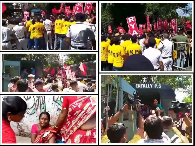 மேற்கு வங்கத்தில் அரசுப் பணிகளில் வேலைக்கு ஆளெடுப்பதில் நடைபெற்ற முறைகேடுகளை கண்டித்து, புரட்சிகர இளைஞர் கழகம் - RYA மற்றும் அகில இந்திய மாணவரத கழகம் - AISA சார்பில், கொல்கத்தாவில் இன்று நடைபெற்ற போராட்டத்தில் மேற்கு வங்க மாநில சிபிஐ-எம்எல் விடுதலை செயலாளர் தோழர் அபிஜித் மஜும்தார், AISA தலைவர் நிலாஷிஸ், RYA தலைவர் ரன்அஜாய் மற்றும் பல முன்னணி தோழர்கள் தாக்கப்பட்டு கைது செய்யப்பட்டுள்ளனர். ஊர்வலமாக சென்றவர்களை ராம்லீலா மைதானத்தில் போலீசார் தடுத்தனர். போலீசார் நடத்திய தடியடி தாக்குதலில் பெண்கள் உட்பட பல தோழர்கள் காயம் அடைந்துள்ளனர்.