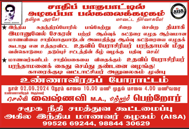 தியாகி இமானுவேல் சேகரன் பற்றிய ஆய்வுக்கு காரைக்குடி அழகப்பா பல்கலைக்கழக வரலாற்றுத்துறை அனுமதி மறுத்திருக்கிறது. வரலாற்றுத்துறை மாணவி வைஷ்ணவி, 2022 -2024 ஆம் கல்வி ஆண்டில், தனது ஆய்வுக் கட்டுரைக்காக ’சுதந்திரப் போராட்டத்தில் பங்கேற்ற வீரர்கள்’ என்ற தலைப்பின் கீழ் தியாகி இமானுவேல்சேகரன் பற்றி ஆய்வு செய்ய திட்டமிட்டிருந்தார். அதனை உதவிப் பேராசிரியர் பரந்தாமனிடம் அறிவித்தார். சாதித்தலைவரைப் பற்றி எழுத வேண்டாமென பரந்தாமன் கூறிவிட்டார். இமானுவேலை சாதித் தலைவரென்று முத்திரை குத்திய பரந்தாமனின் பேச்சு மாணவிக்கு மிகுந்த அதிர்ச்சி அளித்தது. ஆனாலும் அதே தலைப்பில்தான் “கட்டுரையை எழுதப்போகிறேன்” எனச் சொல்லி விட்டார். நான் வழிகாட்டியாக வந்தால் இத்தலைப்பை அனுமதிக்க மாட்டேன் என்று கூறி அவரது சாதி வன்மத்தை வெளிப்படுத்தியுள்ளார்.