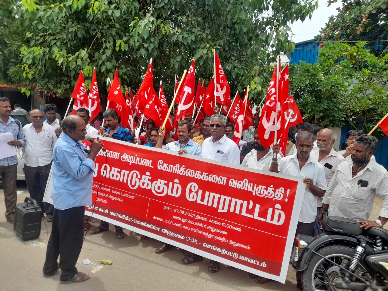 27.6.2022 அன்று வண்டலூர் வட்டாட்சியரிடம் மனைப் பட்டா கேட்டு மனுவும் காட்டாங்குளத்தூர் ஊராட்சி ஆணையரிடம் சாலை வசதி, அடிப்படை வசதிகள் கோரி மனுவும் இகக(மாலெ) கட்சி சார்பாகக் கொடுக்கப்பட்டது. இந்தப் போராட்டம் இகக(மாலெ) சென்னை செங்கல்பட்டு மாவட்டச் செயலாளர் தோழர் சொ.இரணியப்பன் தலைமையில் நடைபெற்றது. இகக(மாலெ) மாநிலச் செயலாளர் தோழர் என்.கே.நடராஜன் போராட்டத்தை வாழ்த்திப் பேசினார்.