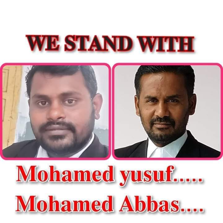 மதுரை வழக்கறிஞர்கள் முகம்மது யூசுப் மற்றும் முகம்மது அப்பாஸ் இருவரும் தேசிய புலனாய்வு முகமை(NIA)யால் குற்றவாளிகளாக வழக்கில் சேர்க்கப்பட்டவர்களுக்காக நீதிமன்றத் தில் ஆஜரானார்கள் என்பதற்காக அவர்களையும் குற்றவாளிகள் ஆக்கி கைது செய்துள்ளது தேசிய புலனாய்வு முகமை. இது வழக்கறிஞர்களின் உரிமையை மட்டுமின்றி வழக்கறிஞர்கள் தொழிலையே முடக்கும் செயல் ஆகும். யுஏபிஏ சட்டத்தின் கீழ் கைது செய்யப்படுபவர்களுக்கு வாதாடும் வழக்கறிஞர்களும் அச்சட்டத்தின் படி குற்றவாளிகள் என்கிற சரத்து அரசியலமைப்புச் சட்டத்திற்கு எதிரான மிகவும் மோசமான சரத்தாகும். அம்பாசமுத்திரம் ஏஎஸ்பி பல் பிடுங்கிய பல்வீர் சிங்கிற்கு எதிராக பாதிக்கப் பட்டவர்களுக்காக வாதாடிய வழக்கறிஞர் மகராஜனை தென்காசி மாவட்டம் பாவூர்சத்திரம் காவல்நிலையத்தில் பொய் வழக்கு போட்டு கைது செய்தார்கள். இதுவும் மனித உரிமை மீறல் ஆகும். குற்றவாளி பல்வீர் சிங்கை இது வரை கைது செய்யவில்லை. பல்பிடுங்கிய வழக்கில் வன்கொடுமை தடுப்புச் சட்டத்தில் வழக்கு பதிவு செய்துள்ள போதும் குற்றவாளிகள் கைது செய்யப்படவில்லை. இந்த சூழ்நிலையில் பாதிக்கப்பட்டவர்களுக்காக குரல் கொடுக்கும் வாதாடும் வழக்கறிஞர்களை அச்சுறுத்தும் வகையில் காவல் துறை கைது செய்து சிறையில் அடைக்கிறது. குறிப்பாக சிறுபான்மை யினருக்காகக் குரல் கொடுக்கும் வழக்கறிஞர்கள் அச்சுறுத்தப்படுகிறார்கள்.