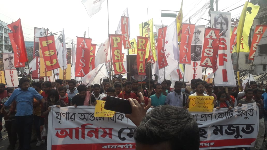 மேற்குவங்க மம்தா ஆட்சியில் அட்டூழியம். இடதுசாரி மாணவர் தலைவர் அனிஷை போலீஸ் உடையில் வந்தவர்கள் தாக்கி படுகொலை செய்தததைக் கண்டித்து இடதுசாரி மாணவர் அமைப்புகள் கொல்கத்தாவில் ஆர்ப்பாட்டம் நடத்தினர். அந்த ஆர்ப்பாட்டத்தில் அகில இந்திய மாணவர் கழகத்தின் தோழர்கள் பலர் கலந்து கொண்டனர்.