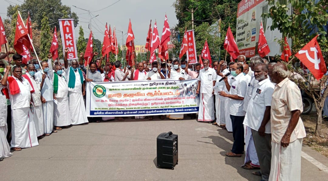 விவசாயிகளின் எழுச்சிகரமான போராட்டத்தின் முன்னால் மண்டியிட்ட, மோடி அரசாங்கம் 3 வேளாண் சட்டங்களை திரும்பப் பெற்றது. அதைத் தொடர்ந்து, குறைந்த பட்ச ஆதார விலை உறுதிச் சட்டம், உயிர் நீத்த 700க்கும் மேலான விவசாய தியாகிகளுக்கு நினைவிடம், அவர்களின் குடும்பத்திற்கு இழப்பீடு போன்ற வாக்குறுதிகள் பற்றி பேசி முடிவு செய்து அறிவிப்பதாக எழுத்து பூர்வமாக அறிவித்தது. ஆனால், கொடுத்த வாக்குறுதியை நிறைவேற்றாமல் துரோகம் செய்கிற மோடி அரசை கண்டித்து 31.1.2022 அன்று நாடு முழுவதும் ஆர்ப்பாட்டம் நடைபெற்றது.