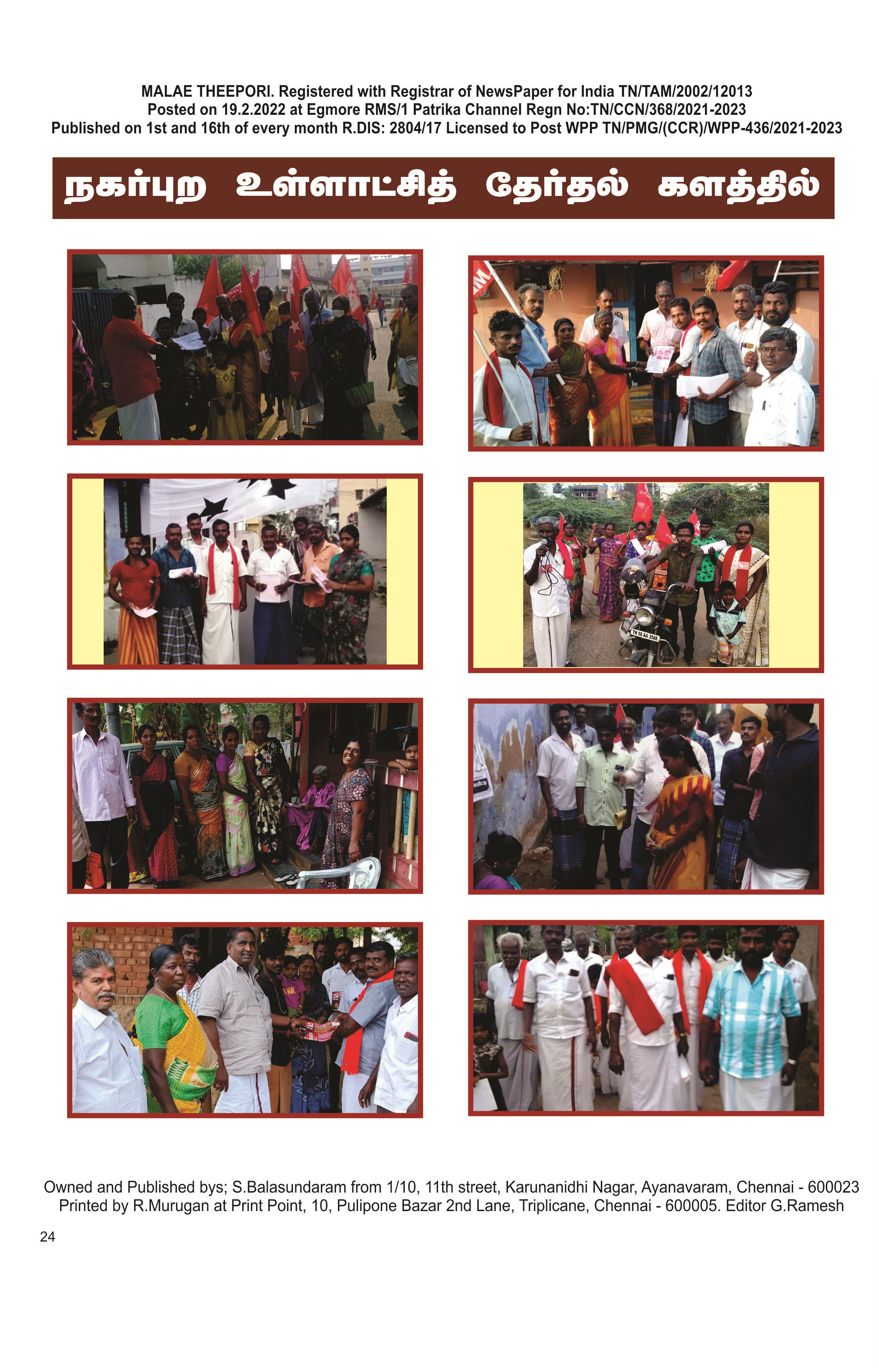 உள்ளாட்சியில் ஜனநாயகத்தைக் கொண்டு வருவது வாக்காளர்கள் கைகளில்தான் உள்ளது. உள்ளாட்சி அமைப்புகள் மக்களாட்சி அமைப்பு களாக செயல்பட வாக்காளர்கள் மேற்கண்ட மக்கள் கோரிக்கைகளை முன்னெடுக்கும் மா லெ கட்சி வேட்பாளர்களுக்கு வாக்களித்து வெற்றிபெறச் செய்ய வேண்டும். பணத்துக்கும் பரிசுப்பொருட்களுக்கும் மதிப்பளிக்காதீர்கள், புறக்கணியுங்கள். மக்கள் கோரிக்கைகளுக்கும் மக்கள் சேவகர்களுக்கும் மதிப்பளியுங்கள். உள்ளாட்சியில் ஜனநாயகம் மலர்வதற்கு முதல்படியாய் மார்க்சிஸ்ட்-லெனினிஸ்ட் வேட்பாளர்களுக்கு மூன்று நட்சத்திரக் கொடி சின்னத்தில் வாக்களித்து வெற்றி பெறச் செய்யுங்கள்! மக்கள் விரோத பாஜக வை தமிழக உள்ளாட்சி அமைப்புகளில் காலூன்ற அனும திக்கவே கூடாது. திமுக - அதிமுக கூட்டணி களுக்கு மாற்றான மக்கள் கட்சிக்கு மூன்று நட்சத்திரக் கொடி சின்னத்தில் வாக்களித்து வெற்றிபெறச்செய்யுங்கள்!