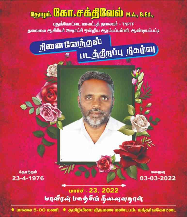 ஆசிரியர், தோழர் சக்திவேல் அவர்கள் வாகன விபத்தொன்றில் அகால மரணம் அடைந்தது கந்தர்வக்கோட்டை சுற்றுவட்டார பகுதிகளில் ஆசிரியப் பெருமக்கள், இடதுசாரி இயக்கத்தினர், உழைக்கும் மக்கள், மாணவர்கள் மத்தியில் பேரதிர்வை ஏற்படுத்தியது.
