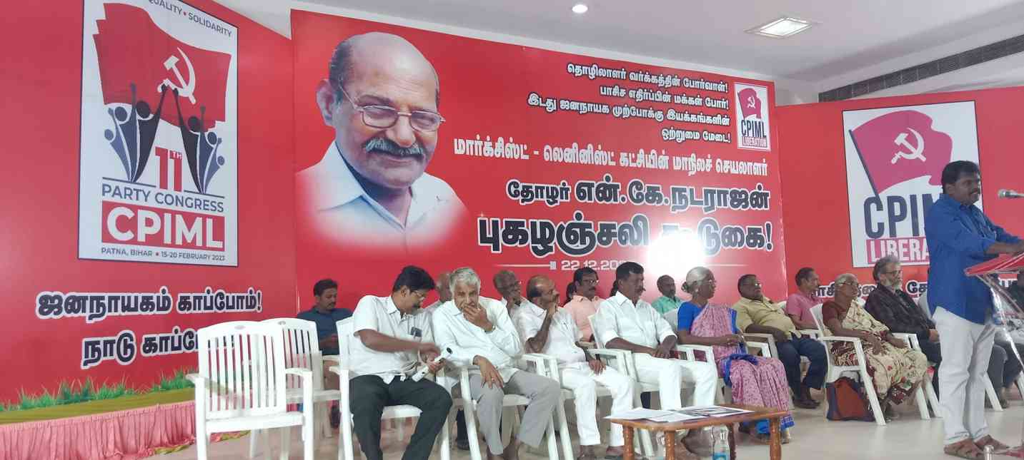 இந்திய கம்யூனிஸ்ட் கட்சி (மார்க்சிஸ்ட்-லெனினிஸ்ட்) விடுதலை கட்சியின் மறைந்த மாநிலச் செயலாளர் தோழர் என்.கே.நடராஜன் அவர்களுக்கு புகழஞ்சலிக் கூட்டம் கோவையில் 22.12.2022 அன்று மாலை நடைபெற்றது. திண்டுக்கல் மாவட்டத் தோழர்கள் கொண்டு வந்திருந்த தோழர் என்.கே. நினைவுச் சுடரை, இகை(மாலெ) பொதுச் செயலாளர் தோழர் திபங்கரிடமும் என்.கே.யின் குடும்பத்தினரிடமும் வழங்கினார்கள். அதனைத் தொடர்ந்து தோழர் என்.கே.நடராஜன் அவர்களின் திருவுருவப் படத்தை தோழர் திபங்கர் திறந்து வைத்து அஞ்சலி செலுத்தினார்.