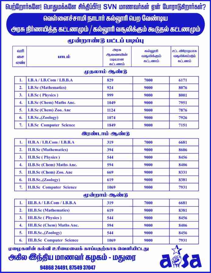 நாடார் கல்லூரியின் கட்டணக் கொள்ளையைப் பற்றி பல்வேறு இயக்கங்களை நடத்தியதாலும், ஆசிரியர்களின் போராட்டங்களாலும், இதுவரை கல்லூரி நிர்வாகம் வசூலித்த கூடுதல் கட்டணத்தை மாணவர்களிடம் திருப்பித் தர வேண்டும், கூடுதல் கட்டணம் வசூல் செய்வதை நிறுத்திக் கொள்ள வேண்டும் என்று உயர் கல்வித் துறையின் பிராந்திய இணை இயக்குநர் உத்தரவிட வேண்டிய நிலை ஏற்பட்டது. தற்போதைய நிலையில் மேற்படி கல்லூரி நிர்வாகம் மாணவர்களுக்கு 8 கோடி ரூபாயைத் திருப்பித் தர வேண்டியுள்ளது. ஆனால், இதுவரை கட்டணக் கொள்ளை ஓயவும் இல்லை. கொள்ளையடிக்கப்பட்ட 8 கோடி ரூபாய் திருப்பித் தரப்படவும் இல்லை அந்த கல்லூரி மீது பிராந்திய இணை இயக்குநர் எவ்வித நடவடிக்கையும் எடுக்கவுமில்லை.