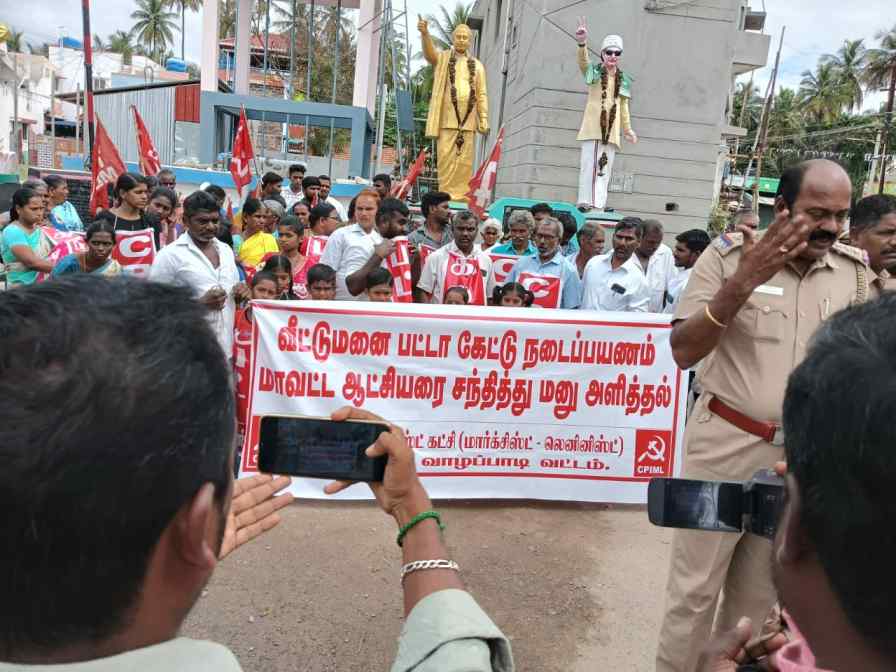 சேலம் மாவட்டம், வாழப்பாடி வட்டம், குறிச்சி ஊராட்சி மக்கள், தாங்கள் வசித்து வரும் வீட்டுமனைகளுக்கு, பட்டா கேட்டு இரண்டாண்டு காலமாக தொடர்ந்து போராடி வருகிறார்கள். சம்பந்தப்பட்ட வட்டாட்சியர் மற்றும் வருவாய் நிர்வாகம் பட்டா கொடுக்காமல் இழுத்தடித்து வருகிறது. எனவே, மாவட்ட ஆட்சியர் கவனத்திற்குக் கொண்டு செல்ல, கட்சி குறிச்சி உள்ளூர் கமிட்டி சார்பில், 15-11-2024 அன்று வெள்ளி காலை 10.00 மணியளவில், குறிச்சியில் இருந்து 40 கி.மீ சேலம் மாவட்ட ஆட்சியர் அலுவலகம் செல்ல நடைபயணம் திட்டம் இடப்பட்டது. நடைபயணத்திற்கு காவல்துறை அனுமதி மறுத்தது; எனினும், தடையை மீறி சுமார் 80 பேர் அணிதிரண்டனர்.