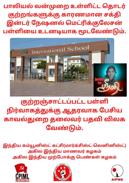 பாலியல் வன்முறை உள்ளிட்ட தொடர் குற்றங்களுக்கு காரணமான சக்தி இன்டர்நேஷனல் மெட்ரிக்குலேசன் பள்ளியை உடனடியாக மூடவேண்டும்!.